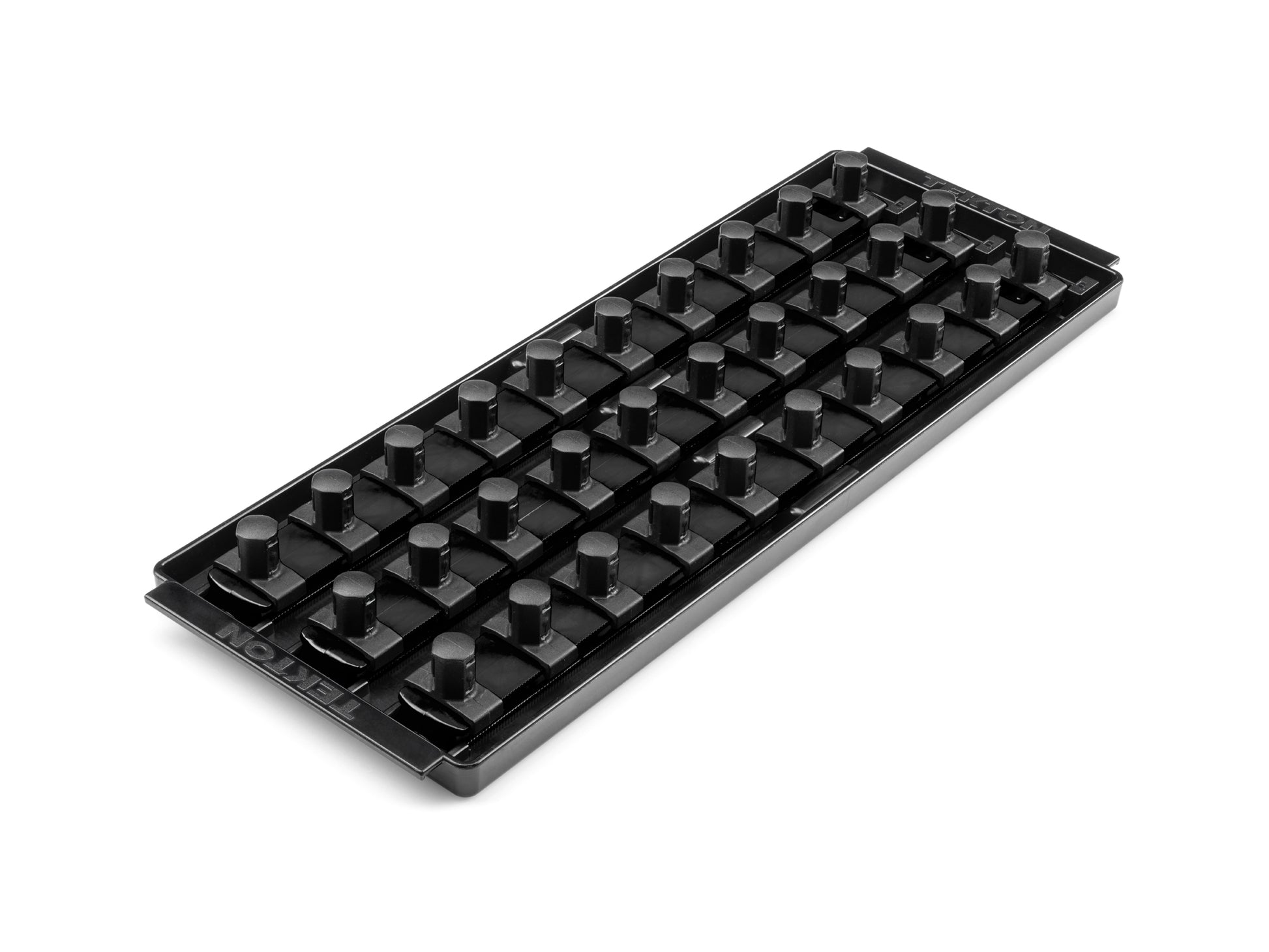 This Tekton Socket Organizer Set is a universal socket organizer that securely holds 1/2 inch drive sockets and bit sockets. Rail capacity may vary based on individual socket diameters. Place sockets onto the clips to store them loosely, or twist them clockwise onto the clips to lock them in place. Detent bumps on the clip tabs engage with the socket to keep it secure, even when on-the-go. Sockets with only two detent grooves, such as impact sockets, will not engage with detent bumps on the tabs if placed incorrectly. Lock the rails into the tray with the keyhole slot. To release, press the button beside the keyhole latch and slide the rail out. The tray securely holds socket rails in an upright position, even through the opening and closing of tool chest drawers. Handles on either side of the tray make it easy to lift out of a drawer. Our rails and trays are molded from strong ABS polymer, providing stiffness and robust support for sockets. The clips are made from durable nylon polymer, designed to withstand frequent socket removal and chemical exposure. For large or heavy socket sets, we recommend fully supporting the rails and trays to prevent bowing.