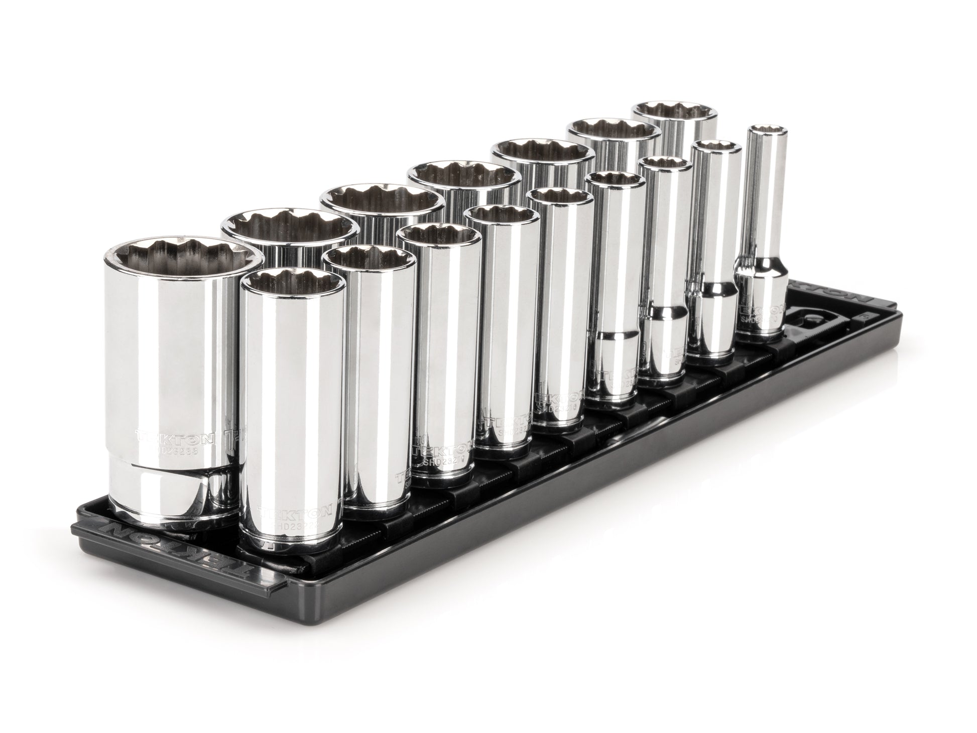 • Deep 12-point opening fits double hex (12-sided), hex, and square-shaped fasteners • Socket geometry is designed to apply force to flat sides of fasteners and not the corners, preventing round-off • Deep-length sockets reach into wells and accommodate the excess threads of longer shafts • Extra-large die-stamped size markings are easy to read and can’t wear off • Polished, chrome-plated finish easily wipes clean and is highly resistant to corrosion • Four detent grooves provide a secure connection with the drive tool • Beveled inner rim of the socket opening helps guide it smoothly onto fasteners • Twist-to-lock socket rail organizes and securely holds sockets in place, both for in your toolbox and on the go