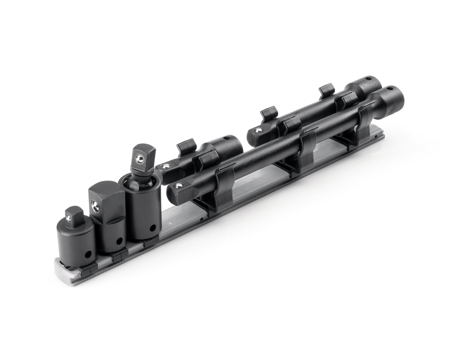 Tekton impact drive accessories complement your existing socket system. This set includes 1/2 inch drive 3, 6, and 10 inch impact extensions, along with an impact universal joint, adapter, and reducer. Attach an extension to your drive tool for reaching past obstructions or into tight, narrow spaces with your socket. Reach around obstructions and access fasteners at an angle with the universal joint. The adapter allows you to adapt 1/2 inch drive tools to 3/4 inch drive sockets, and the reducer adapts 1/2 inch drive tools to 3/8 inch sockets. The included organization rail comes with twist lock clips and top-mount extension holders. Ridges along the rail prevent the clips and holders from sliding, and a keyhole slot helps it lock into a tray.