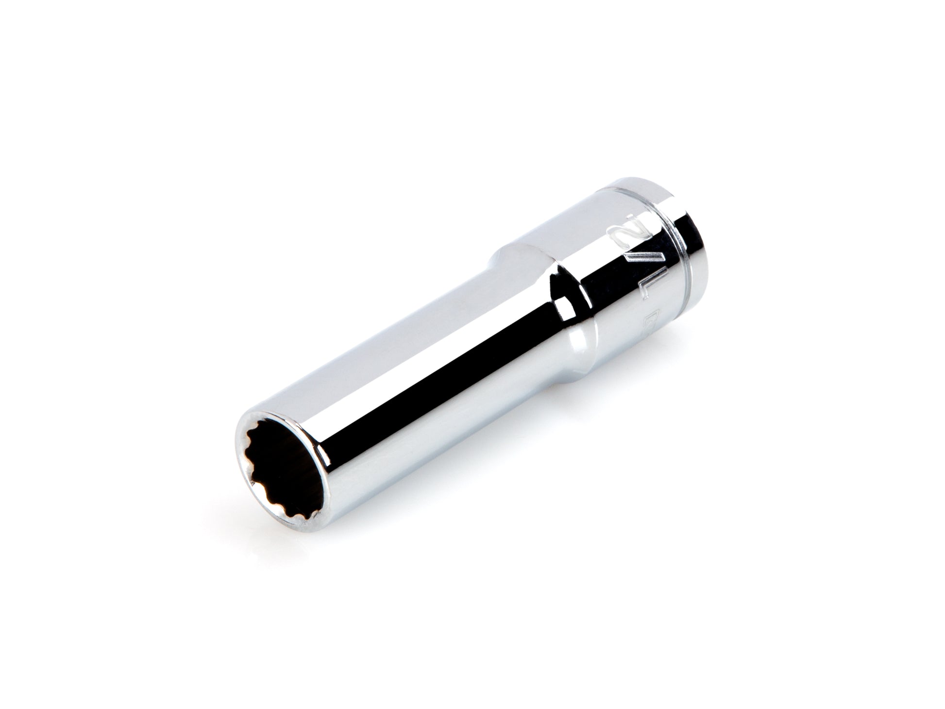 Tekton 1/2 inch drive deep 12-point sockets are an exact fit for double hex fasteners and also work with hex and square shapes. They're designed to grip the sides and not the corners of the fastener heads, which prevents round-off. Their extended length allows the deep socket to fit over long fasteners and reach into recessed areas. The large, die-stamped markings are permanently impressed into the material and optimized for readability.