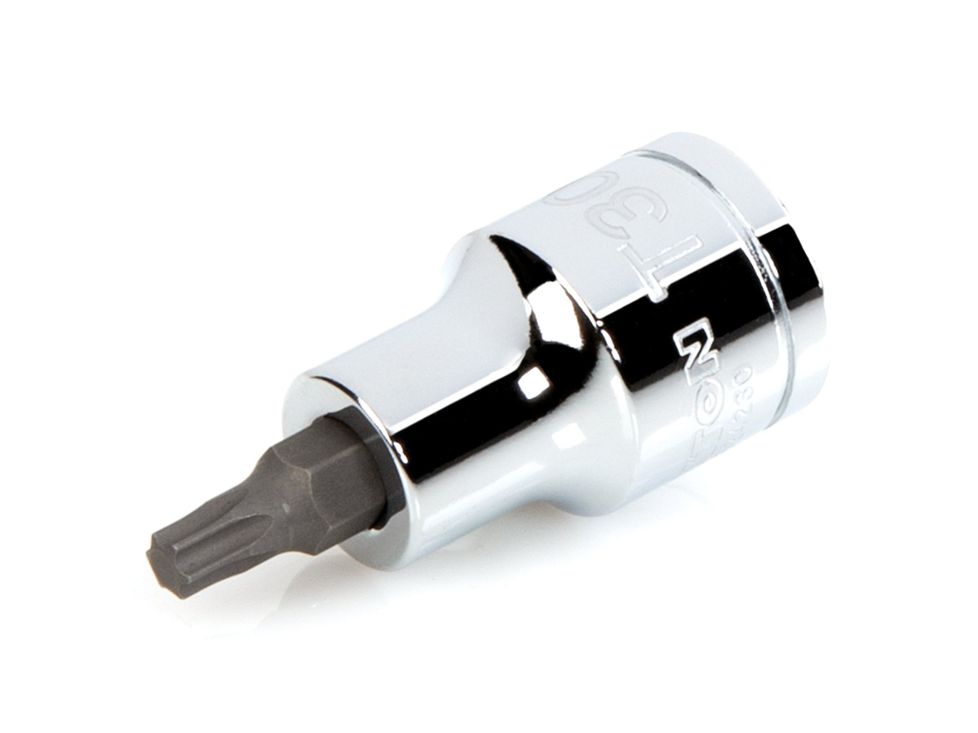 • S2 steel bit is press-fit into the socket for a straight, permanent connection that can't loosen over time • Star-shaped Torx® bit has 6-lobes machined to precise tolerances for an exact, high-torque fit that resists camming out • Large, clear die-stamped size marking is easy to read and can’t wear off • Four detent grooves provide a secure connection with the drive tool and a drilled through-hole allows locking on with retaining pin • Polished, chrome-plated finish easily wipes clean and is highly resistant to corrosion • Beveled inner rim of the socket opening helps guide it smoothly onto fasteners • Overall Length: 2.2 in., Shaft Diameter: 0.31 in., Drive End Diameter: 0.94 in., Exposed Bit Length: 0.7 in.