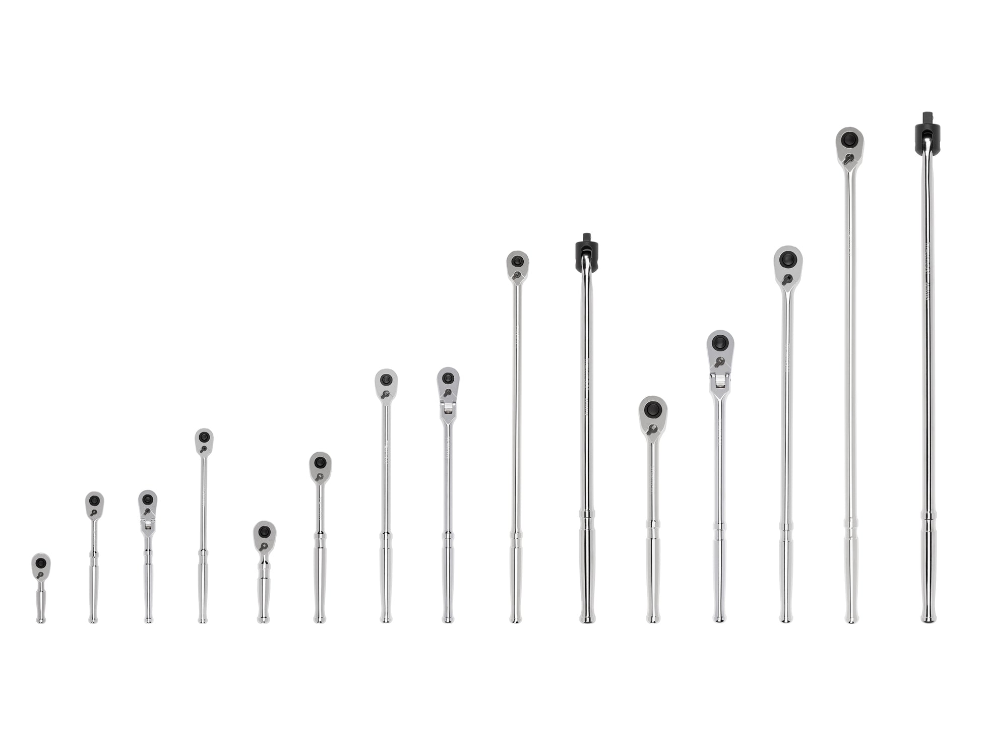 Tekton 1/4, 3/8, 1/2 inch drive ratchets have a 90-tooth gear that produces a working swing arc of 4 degrees. The single half-moon pawl maintains 9 teeth engaged with the gear at all times, ensuring that it won't slip or skip under stress. The quick-release drive tang retains sockets with a spring-actuated detent ball—press the release button to easily add to or drop sockets from the drive tang. The handle's finger groove has pronounced interior edges for traction and control with any finger placement. The pommel at the end of the handle keeps your hand from slipping off and is rounded for comfort. Unlike conventional "low profile" designs that focus on controlling only the thickness of the head, we reduced the size in every dimension: length, width, and height. Tekton ratchets meet (and most far exceed) the industry standard for proof torque, a measure of strength verified by a single-cycle test that applies torque until the specified value is reached without failure or any permanent deformation. The included breaker bars can be used to reach and break free rusted or stuck nuts and bolts.