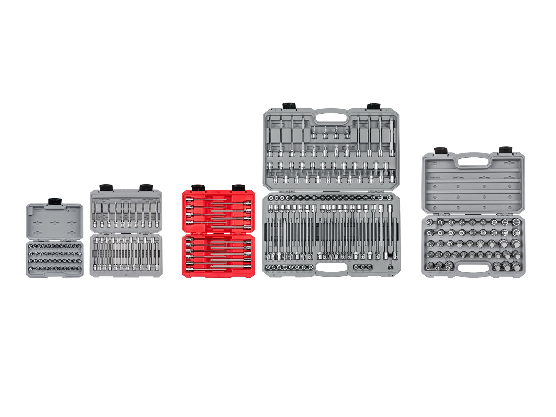 The Tekton 1/4, 3/8, and 1/2 inch drive bit socket set includes hex, ball end hex, Torx, TR Torx, Phillips, slotted, square, and TR triple square bit sockets in standard and long lengths. Tekton heat-treated S2 steel bits are press-fit into the socket for a straight, tightly mated fit that can't loosen over time or under stress. The tips are machined to exact tolerances for precise engagement with fasteners. Large, stamped size markings are permanently impressed into the material by a roll-stamp die. Detent grooves and beveled edges provide a smooth and secure connection with the drive tool. This set includes five carrying cases made from a high-density polyethylene material that withstands exposure to common lubricants, fuels, and solvents.