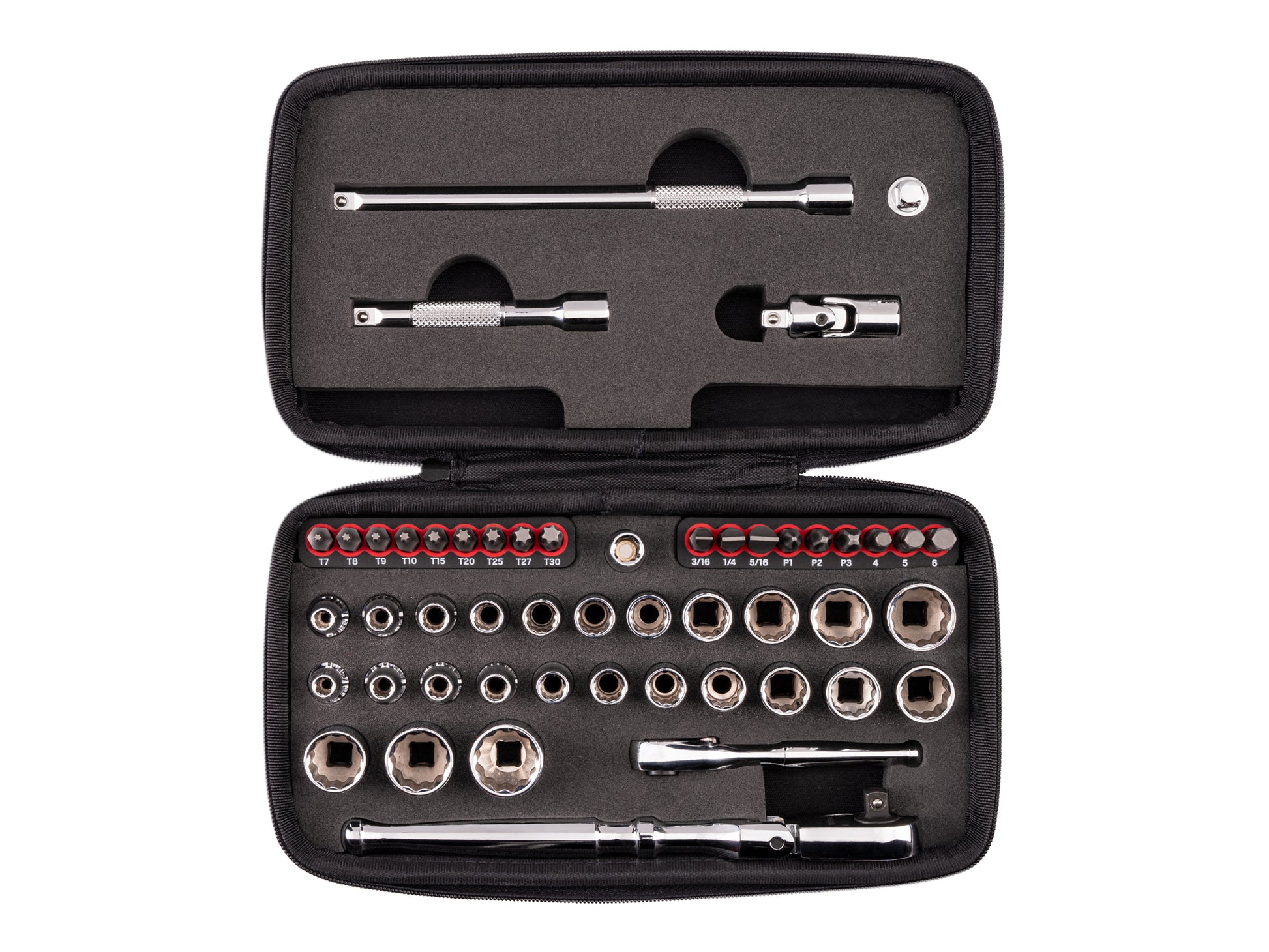 The Tekton 1/4 Inch Drive Small Engine Socket, Bit, and Ratchet Set with Case is designed to be a compact, portable solution for maintaining a wide range of yard equipment and powersports machines such as chainsaws, lawnmowers, four-wheelers, and outboard motors. It's also a practical go-to set for general repairs beyond small engines, including general aviation work. The set includes 5/32 - 9/16 inch and 4 - 15 mm 12-point shallow sockets, 3/16 - 5/16 inch (slotted), #1 - #3 (Phillips), 4 - 6 mm (hex), and T7 - T30 (star) 1/4 inch bits, a 90-tooth flex head quick-release ratchet, a 72-tooth bit ratchet, a universal joint, 3/4, 3, and 6 inch extensions, and a magnetic hex bit holder. The set fits in a soft-shell carrying case with EVA foam and zippered closure.