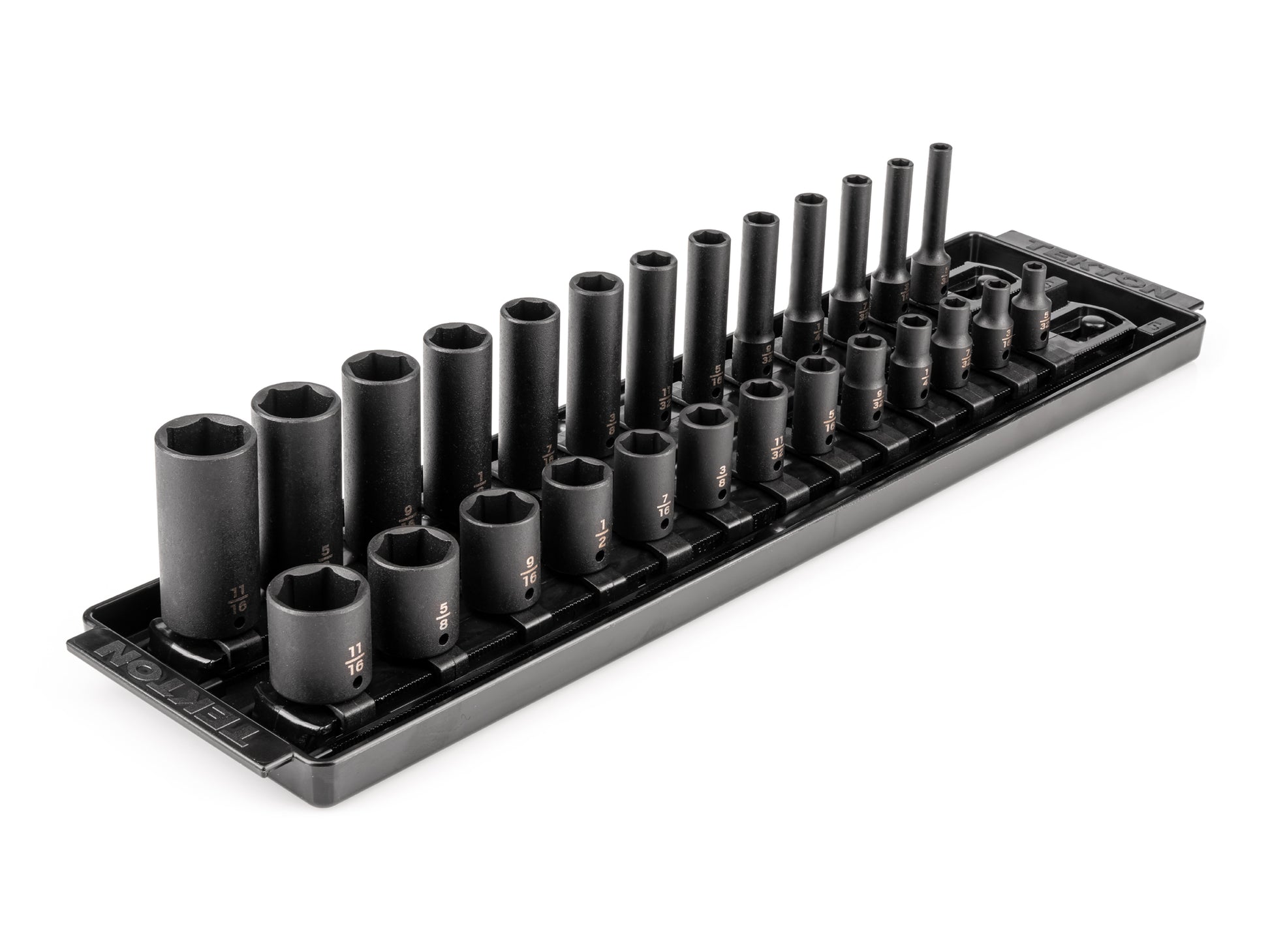 Tekton shallow and deep impact sockets have two size markings—both a high-visibility laser marking and a permanent stamped marking. The interior well of the socket extends fully into the socket, which allows for better fastener engagement in more situations. Each socket works with both friction ring and detent pin anvils. Smooth walls without grooves support friction ring engagement, and a detent pin hole on one side allows you to decide whether to engage the pin. Radiused corners on the socket prevent fastener round-off by applying force to a fastener's flat sides, rather than its corners. Part by part, we choose the best combination of steel alloys, heat treating specifications, and forming processes to meet the highest performance requirements. All pieces in this set have a corrosion-resistant manganese phosphate coating. This set includes socket rail organization with twist-to-lock clips.