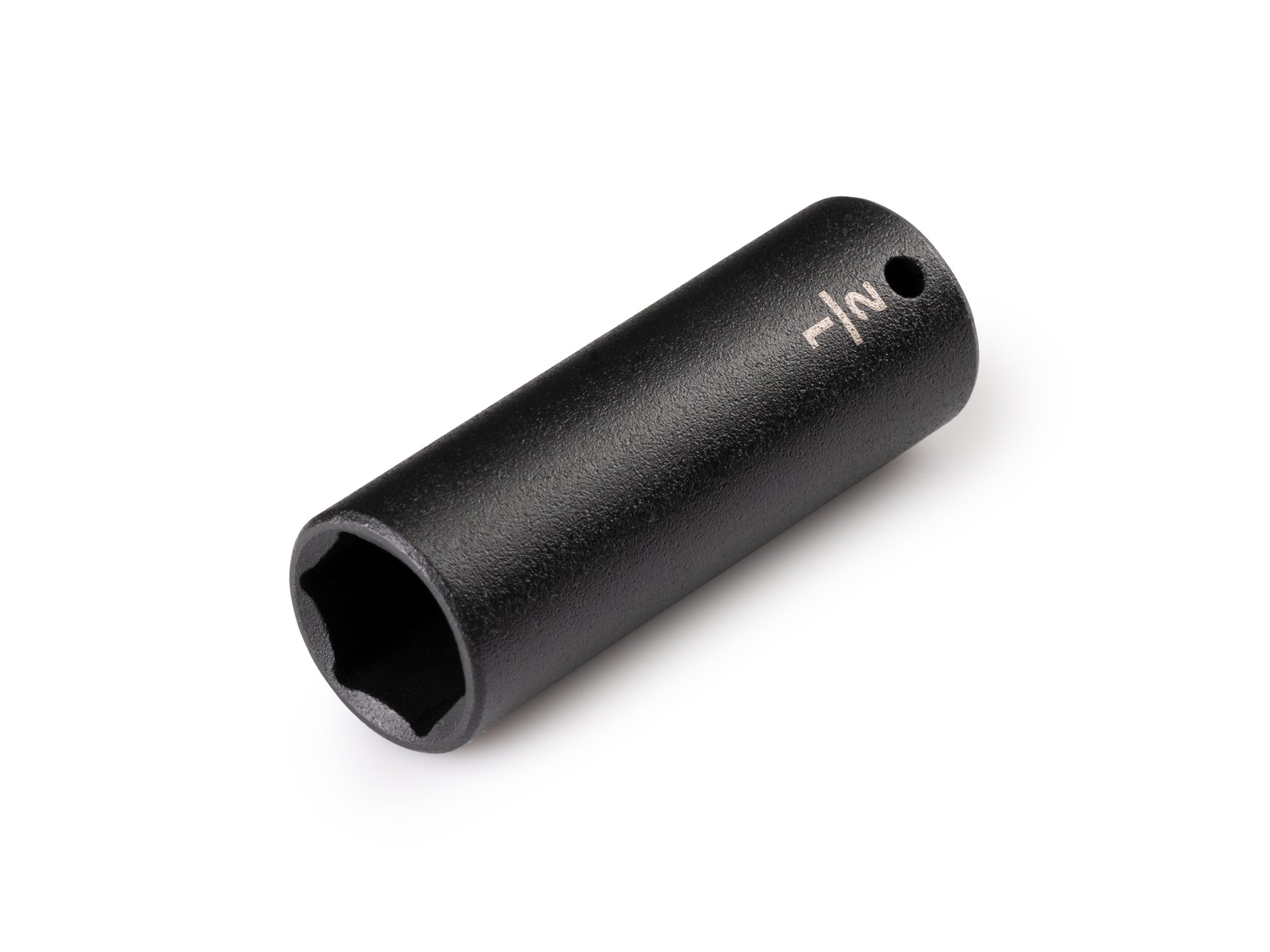 Tekton deep impact sockets have two size markings—both a high-visibility laser marking and a permanent stamped marking. The interior well of the socket extends fully into the socket, which allows for better fastener engagement in more situations. Each socket works with both friction ring and detent pin anvils. Smooth walls without grooves support friction ring engagement, and a detent pin hole on one side allows you to decide whether to engage the pin. Radiused corners on the socket prevent fastener round-off by applying force to a fastener's flat sides, rather than its corners. Part by part, we choose the best combination of steel alloys, heat treating specifications, and forming processes to meet the highest performance requirements. This socket has a corrosion-resistant manganese phosphate coating.