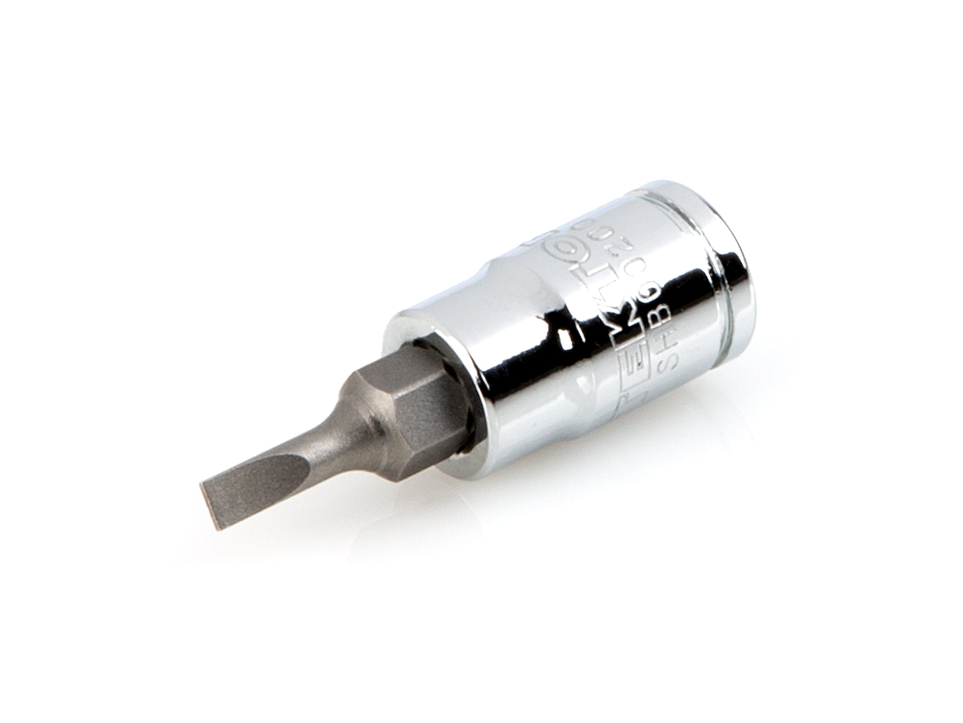 Tekton S2 steel bits are press-fit into the socket for a straight, permanent connection that can't loosen over time. The slotted tip is machined to create parallel, flat faces for best engagement with the straight sides of a fastener slot.