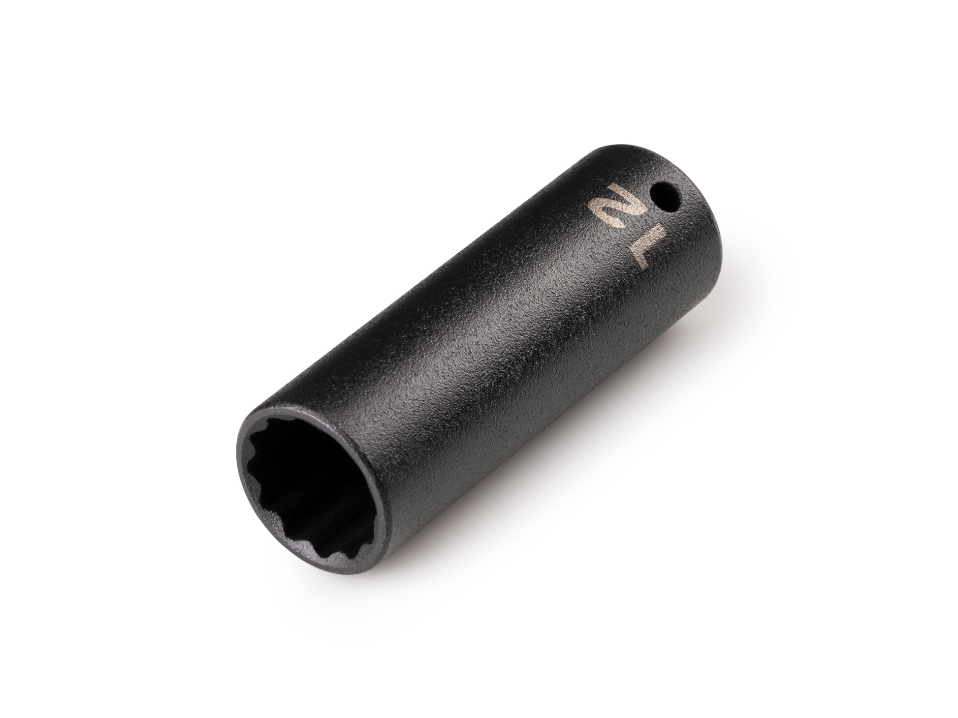 Tekton deep impact sockets have two size markings—both a high-visibility laser marking and a permanent stamped marking. The interior well of the socket extends fully into the socket, which allows for better fastener engagement in more situations. Each socket works with both friction ring and detent pin anvils. Smooth walls without grooves support friction ring engagement, and a detent pin hole on one side allows you to decide whether to engage the pin. Radiused corners on the socket prevent fastener round-off by applying force to a fastener's flat sides, rather than its corners. Part by part, we choose the best combination of steel alloys, heat treating specifications, and forming processes to meet the highest performance requirements. This socket has a corrosion-resistant manganese phosphate coating.