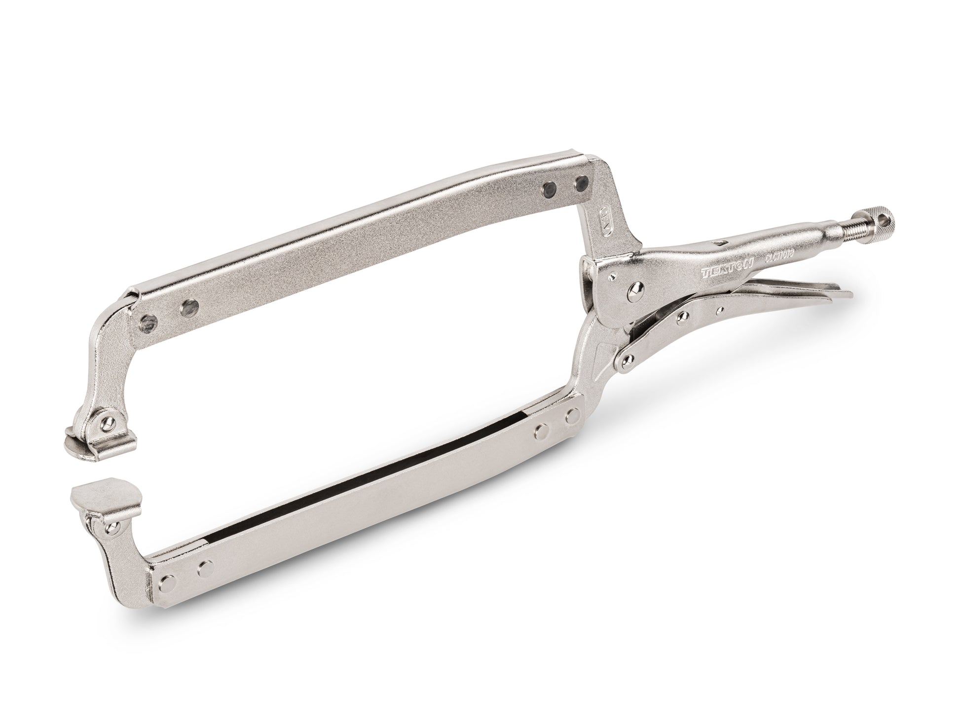 Tekton swivel pad locking C-clamps apply a flat, uniform clamping force that provides more surface contact than fixed points, offering a more secure and gentler hold on a variety of materials, including those with soft or uneven surfaces. Long reach jaws are designed for clamping large or hard-to-access workpieces, ideal for welding, fabrication, and woodworking. Easily set, release, and reposition the clamp with one hand and with more control than a traditional pinch-style lever. The adjustment knob is knurled and round to provide grip for making adjustments even when you're wearing gloves or have slippery hands. Get extra leverage and fine-tune your clamping force by inserting a screwdriver or hex key into the through-hole to create a T-handle. Clamping force at the jaws directly depends on the strength and integrity of the clamp’s three main rivets, which together make up the 4-point mechanical structure of the clamp. To make sure ours can withstand high shear forces, these rivets are made from tough 4135 chromium molybdenum steel. The clamp has a durable, nickel-plated finish that protects against corrosion.