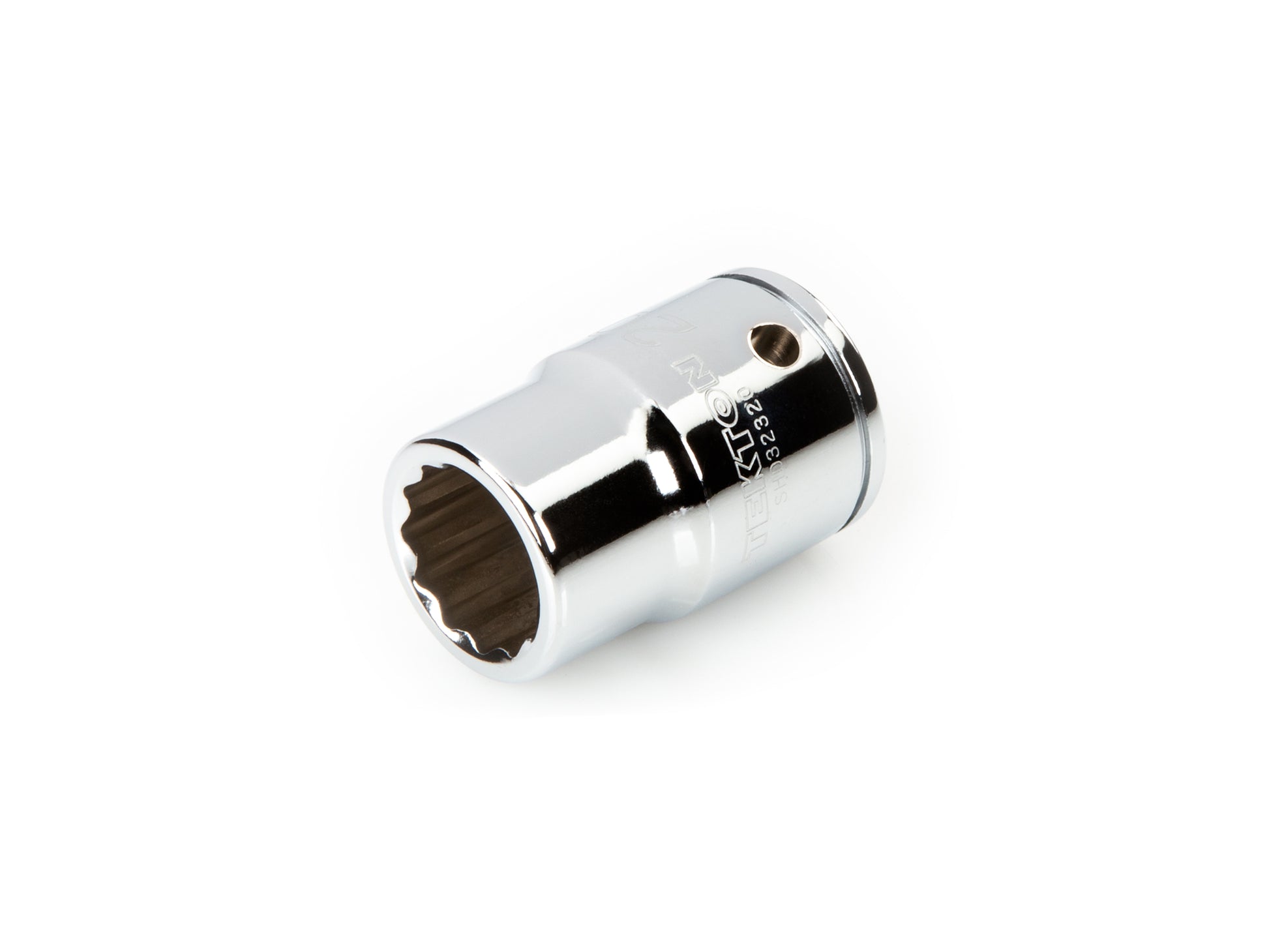 • Shallow 12-point opening fits double hex (12-sided), hex, and square-shaped fasteners • Socket geometry is designed to apply force to flat sides of fasteners and not the corners, preventing round-off • Shallow-length socket is relatively versatile and suitable for a wide range of applications • Extra-large die-stamped size markings are easy to read and can’t wear off • Polished, chrome-plated finish easily wipes clean and is highly resistant to corrosion • Detent grooves provide a secure connection with the drive tool and a drilled through-hole allows locking on with retaining pin • Beveled inner rim of the socket opening helps guide it smoothly onto fasteners