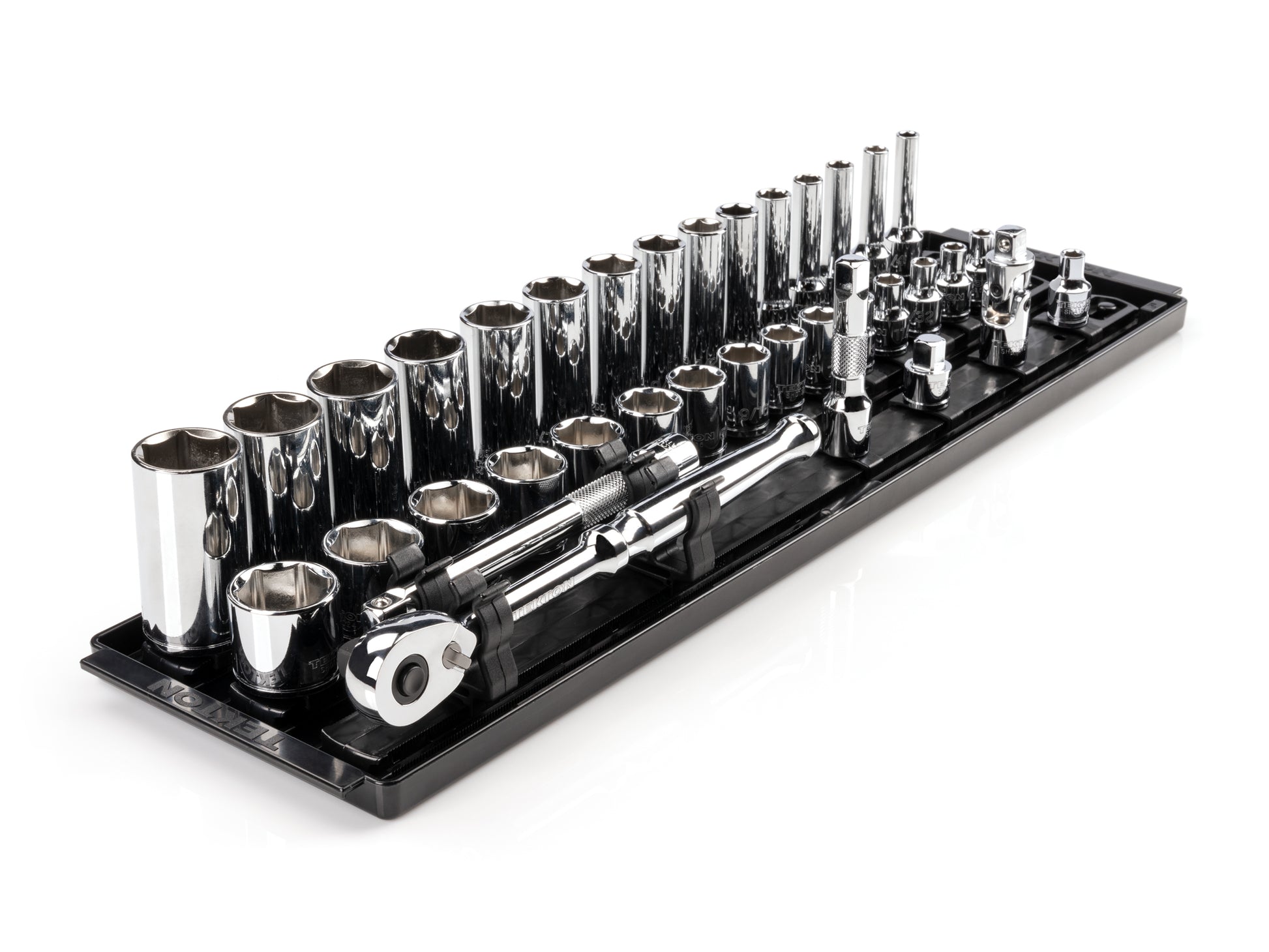 • Shallow and deep 6-point socket opening provides an ideal, exact fit for hex-shaped fastener heads • Socket geometry is designed to apply force to flat sides of fasteners and not the corners, preventing round-off • Includes shallow and deep length sockets • Extra-large die-stamped size markings are easy to read and can’t wear off • Polished, chrome-plated finish easily wipes clean and is highly resistant to corrosion • Four detent grooves provide a secure connection with the drive tool • Beveled inner rim of the socket opening helps guide it smoothly onto fasteners • Twist-to-lock socket rail organizes and securely holds sockets in place, both for in your toolbox and on the go
