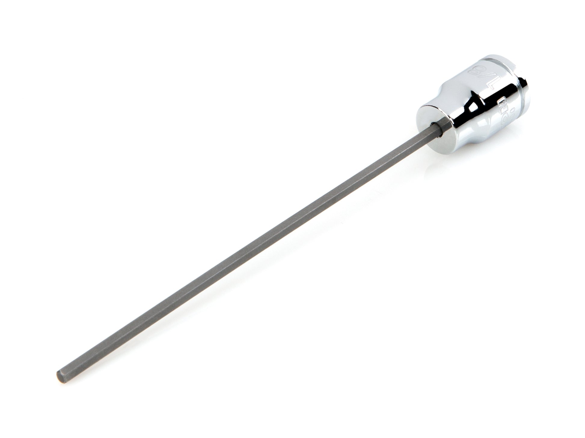 • S2 steel bit is press-fit into the socket for a straight, permanent connection that can't loosen over time • 6-sided hexagonal tip is machined to precise tolerances for an exact fit with hex fasteners • Extra-long bits allow you to reach deep into especially narrow, recessed areas • Large, clear die-stamped size marking is easy to read and can’t wear off • Four detent grooves provide a secure connection with the drive tool and a drilled through-hole allows locking on with retaining pin • Polished, chrome-plated finish easily wipes clean and is highly resistant to corrosion • Beveled inner rim of the socket opening helps guide it smoothly onto fasteners