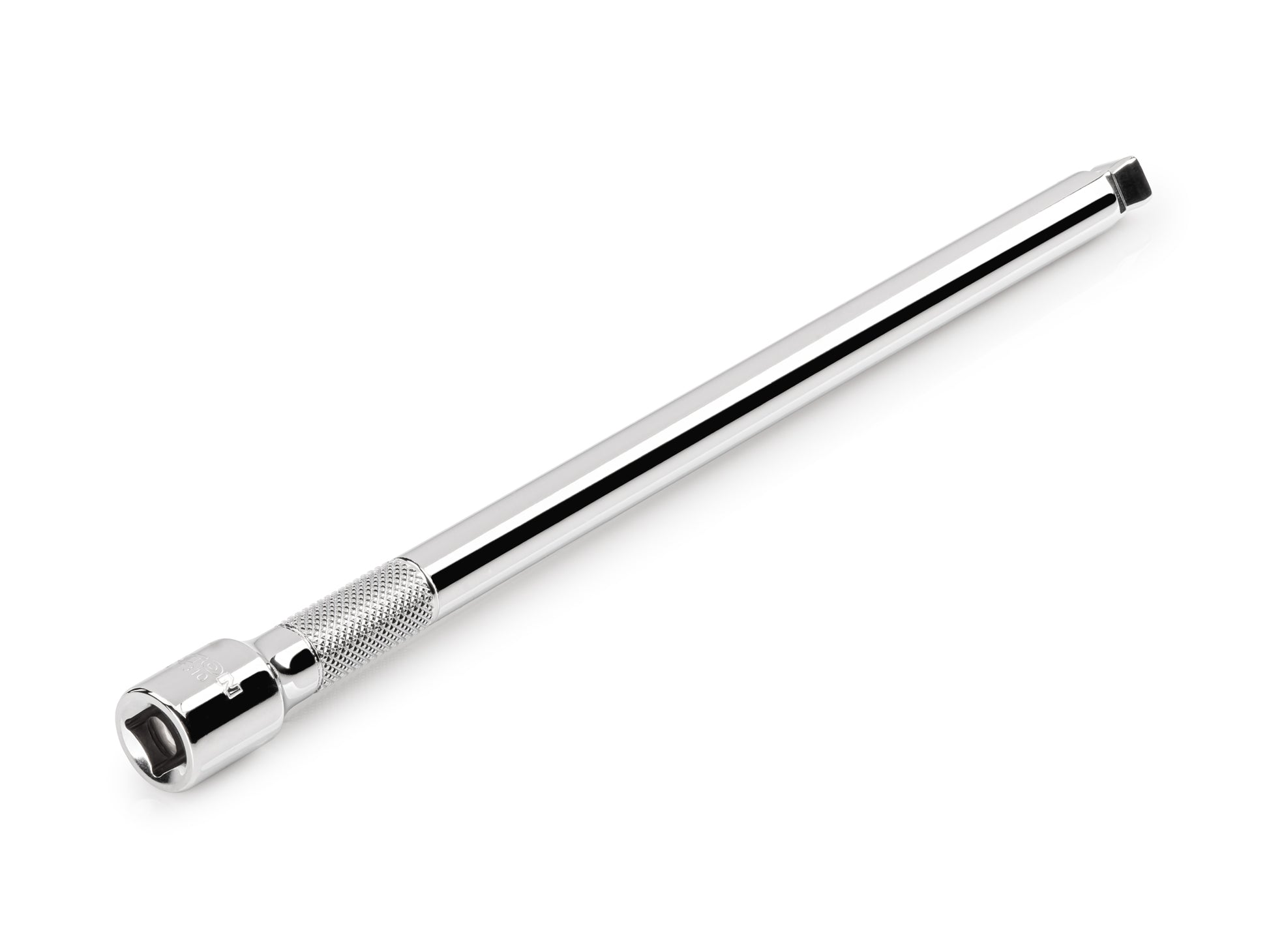 Tekton Wobble Extensions offer two positions for use: a wobble position that allows the extension to operate at an angle of at least 7.5 degrees in any direction and a straight position that allows the wobble extension to act as a traditional extension. The narrowed base of the wobble extension drive tang allows it to operate at an angle, but also makes it slightly less strong than a regular extension. The extensions are made from 6140 chromium-vanadium steel for strength and durability, and are chrome-plated for corrosion resistance. Deep knurling provides grip for turning fasteners and grooves provide grip for attaching and removing sockets and accessories.