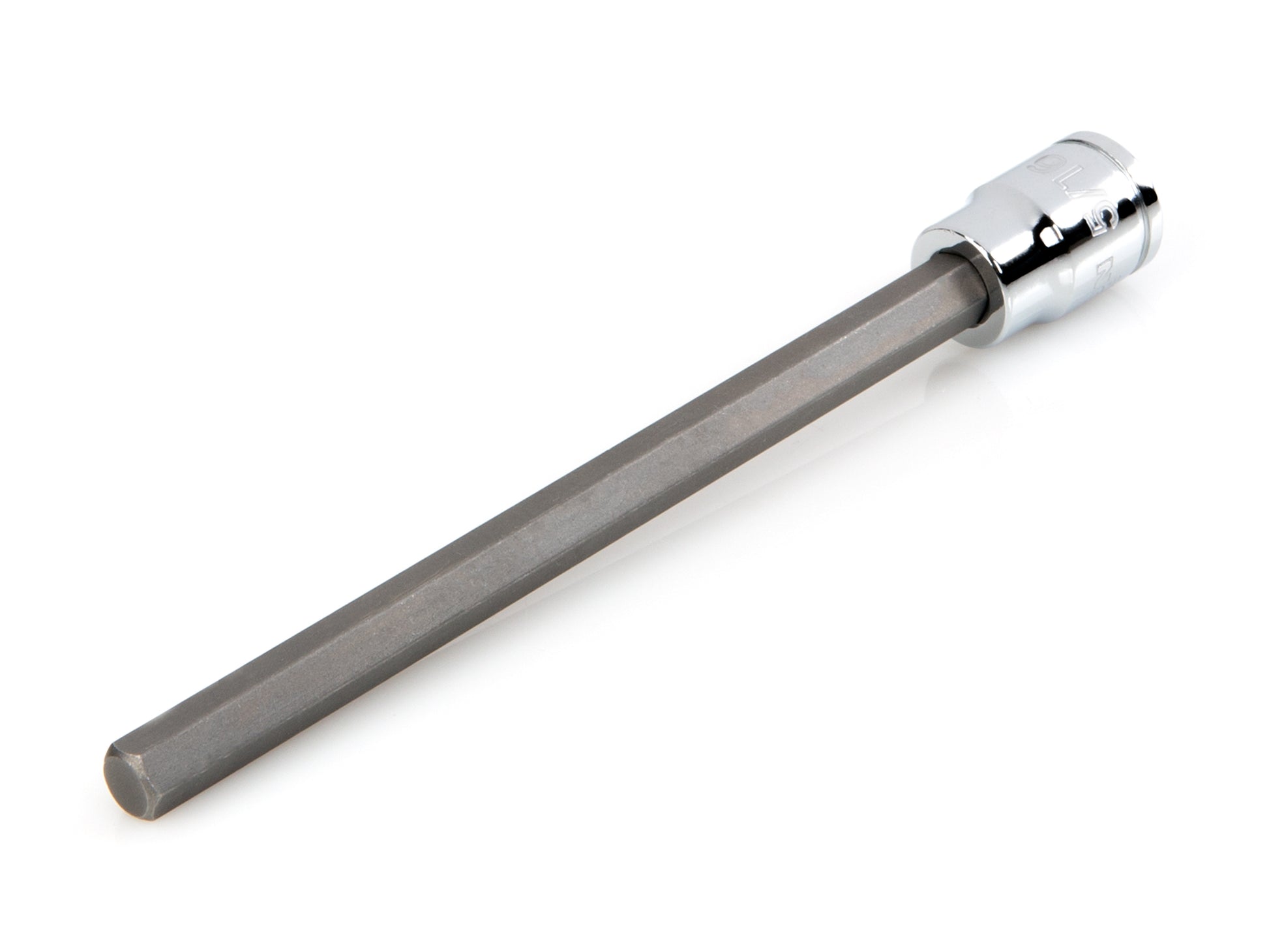 • S2 steel bit is press-fit into the socket for a straight, permanent connection that can't loosen over time • 6-sided hexagonal tip is machined to precise tolerances for an exact fit with hex fasteners • Extra-long bits allow you to reach deep into especially narrow, recessed areas • Large, clear die-stamped size marking is easy to read and can’t wear off • Four detent grooves provide a secure connection with the drive tool and a drilled through-hole allows locking on with retaining pin • Polished, chrome-plated finish easily wipes clean and is highly resistant to corrosion • Beveled inner rim of the socket opening helps guide it smoothly onto fasteners
