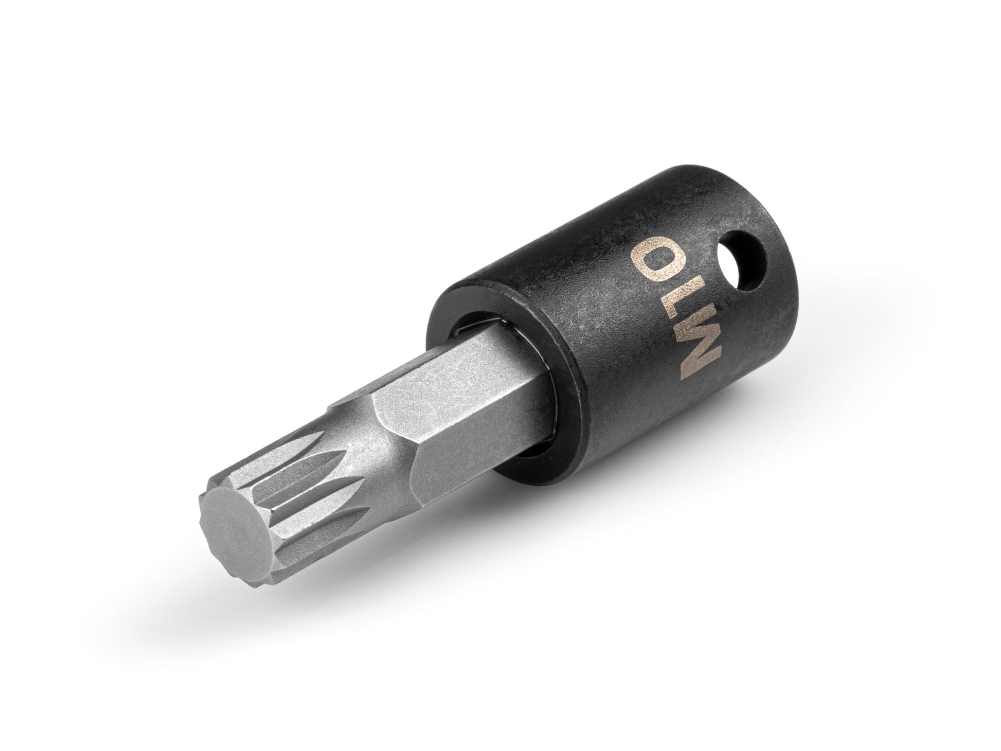 Tekton's two-piece design allows us to optimize the steel alloys, heat treatments, and forming processes for the bit and socket separately, resulting in a tool that's higher performing and more durable than traditional one-piece impact bit sockets. The two pieces are permanently press-fit together and won't loosen over time. The socket is made is made from 6140 chromium-vanadium steel that's heat-treated to 40–47 HRC for use on impact wrenches. The socket is also coated with a manganese phosphate finish to resist corrosion. The bits are made from S2 steel that's heat-treated to a higher hardness (58–62 HRC) to help maintain their geometry under stress. The inside of the socket's drive end has smooth walls with no detent grooves to support engagement with drive tools that use friction ring anvils. A detent pin hole on one side of the drive end also supports engagement with detent pin anvil styles.