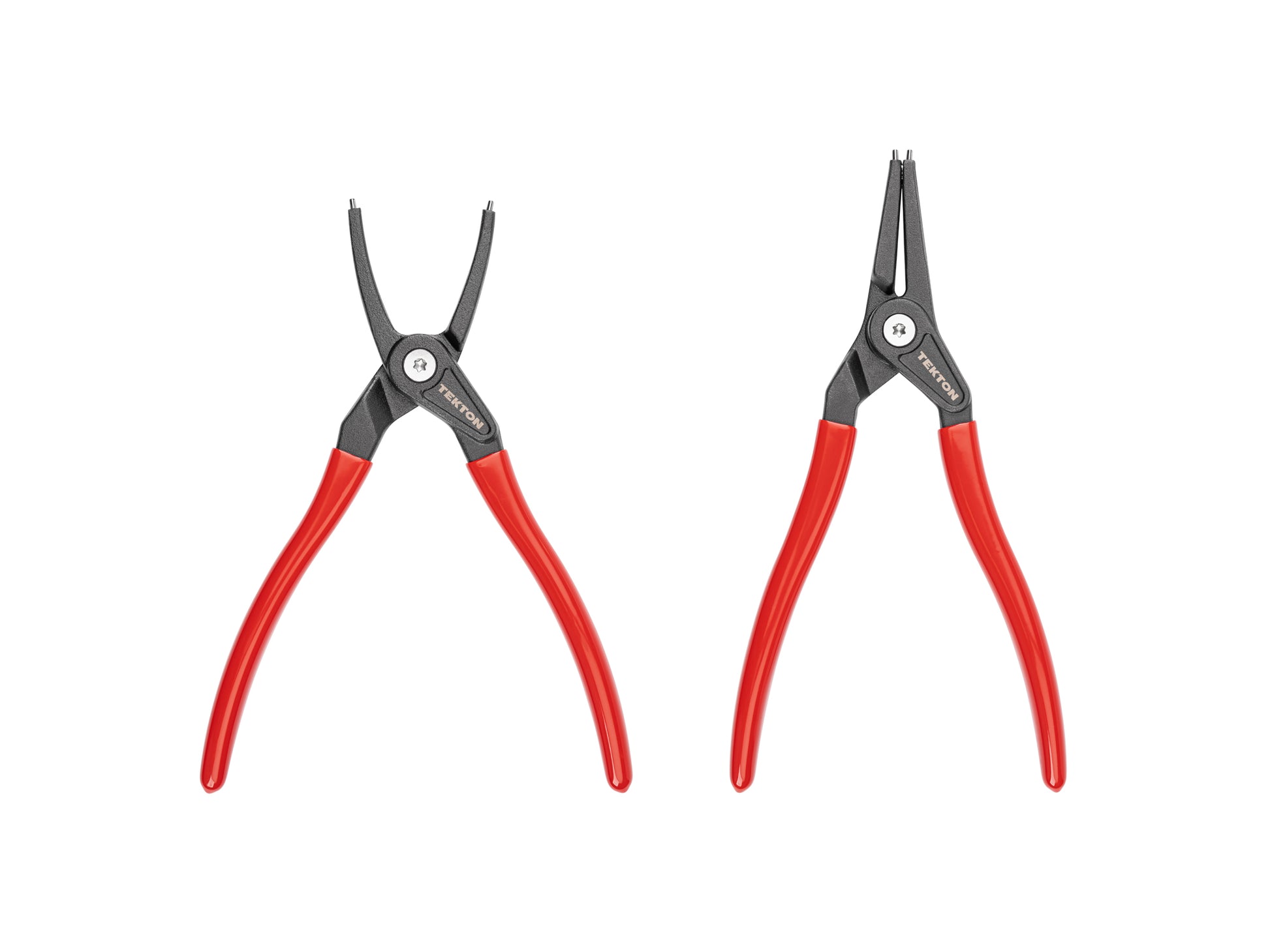 Tekton Retaining Ring Pliers are built for a single, dedicated purpose. By keeping things simple and free of unnecessary features, they remain lean and optimized for the job. Just grab them and go—no adjustments, loose parts, or compromises. The tips of the pliers are angled to securely hold the ring with a downward pressure, preventing the ring from slipping off. The tips are smooth, straight, and free of burrs to create a consistent, controlled grip on the ring. A crimp at the end of each jaw permanently holds the tips in place. The two forged handles are permanently bolted together and spring-loaded. The spring is oiled and housed inside the joint, keeping it hidden and protected while providing smooth, quiet operation. The joint is not adjustable or serviceable. The forged handles get wider in the center and are coated with vinyl grips to improve control and comfort. The tip size and function are clearly laser-marked on the pliers for quick reference. The tips are made of ASTM-E52100 bearing steel that's hardened to 47–53 HRC with nickel plating. The jaws are made of S45C steel that's hardened to 37–43 HRC with black oxide finish and a light coating of rust inhibitor. The pivot screw is made of AISI-1015 steel with nickel plating. It is not removable. The handle grips are made of single-layer vinyl, and the oiled internal spring is made of 1065 spring steel.