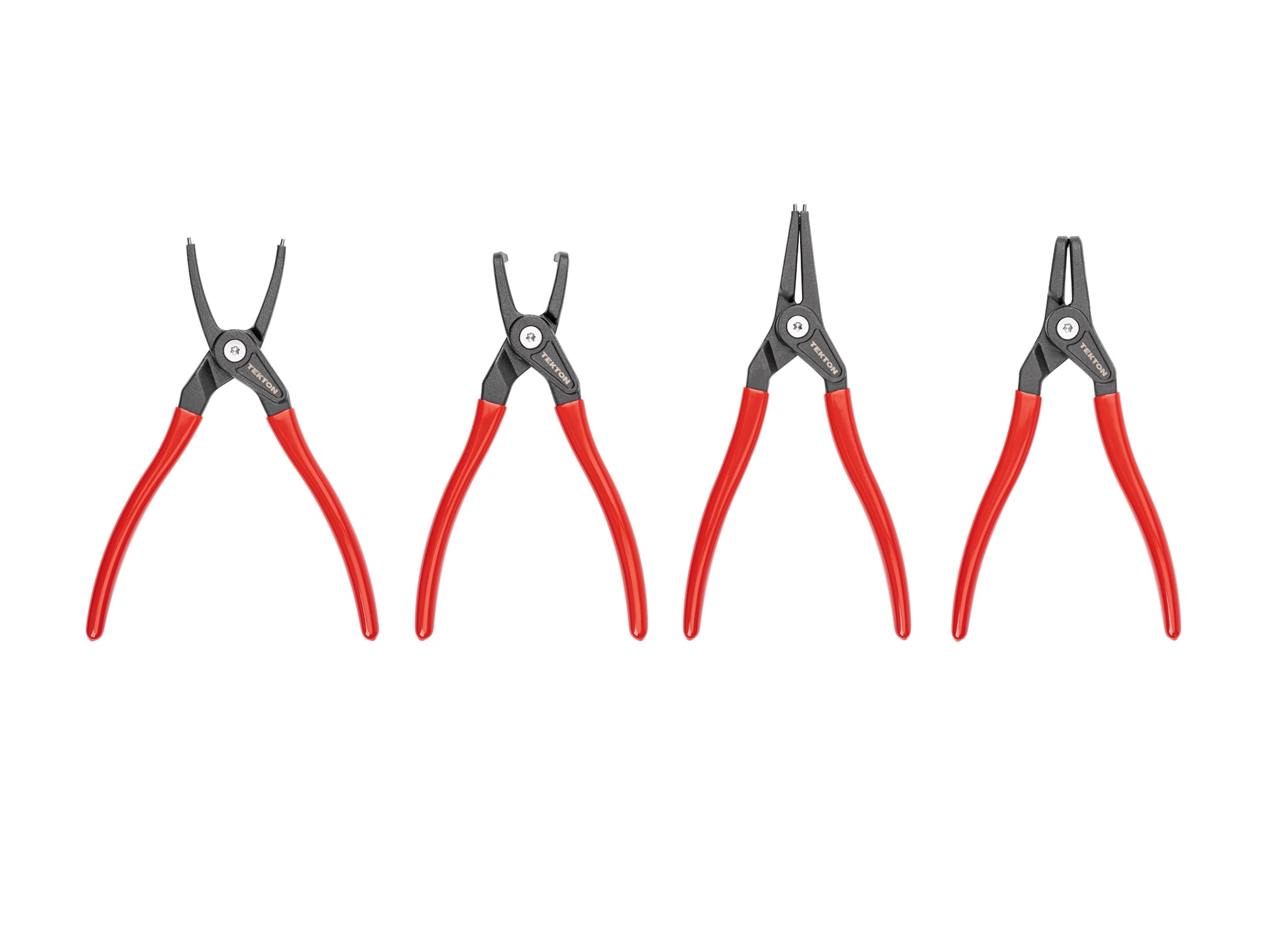 Tekton Retaining Ring Pliers are built for a single, dedicated purpose. By keeping things simple and free of unnecessary features, they remain lean and optimized for the job. Just grab them and go—no adjustments, loose parts, or compromises. The tips of the pliers are angled to securely hold the ring with a downward pressure, preventing the ring from slipping off. The tips are smooth, straight, and free of burrs to create a consistent, controlled grip on the ring. A crimp at the end of each jaw permanently holds the tips in place. The two forged handles are permanently bolted together and spring-loaded. The spring is oiled and housed inside the joint, keeping it hidden and protected while providing smooth, quiet operation. The joint is not adjustable or serviceable. The forged handles get wider in the center and are coated with vinyl grips to improve control and comfort. The tip size and function are clearly laser-marked on the pliers for quick reference. The tips are made of ASTM-E52100 bearing steel that's hardened to 47–53 HRC with nickel plating. The jaws are made of S45C steel that's hardened to 37–43 HRC with black oxide finish and a light coating of rust inhibitor. The pivot screw is made of AISI-1015 steel with nickel plating. It is not removable. The handle grips are made of single-layer vinyl, and the oiled internal spring is made of 1065 spring steel.