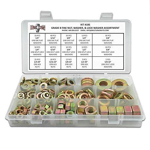 Part Number: Assortment Kit #186 351 Pieces Grade 8 Fine Hex Nut, Flat Washer, Lock Washer Kit Container Information: