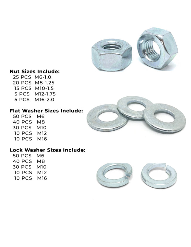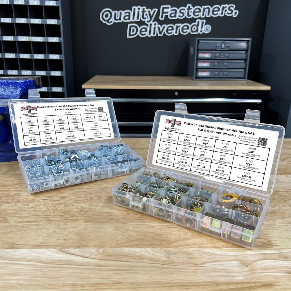 Part Number: Assortment Kit #187 702 Pieces Kit #184: Grade 8 Inch Hex Nut, Flat Washer, Lock Washer Kit Kit #185: Grade 10.9 Metric Hex Nut, Flat Washer, Lock Washer Kit Container Information:
