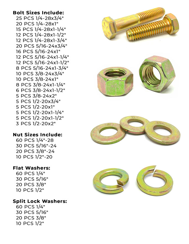 Inch Grade 8 Hex Cap Screws, Hex Nuts, Flat & Lock Washers Fine Thread Zinc Yellow 1/4", 5/16" 3/8", & 1/2" - 575 PCS
