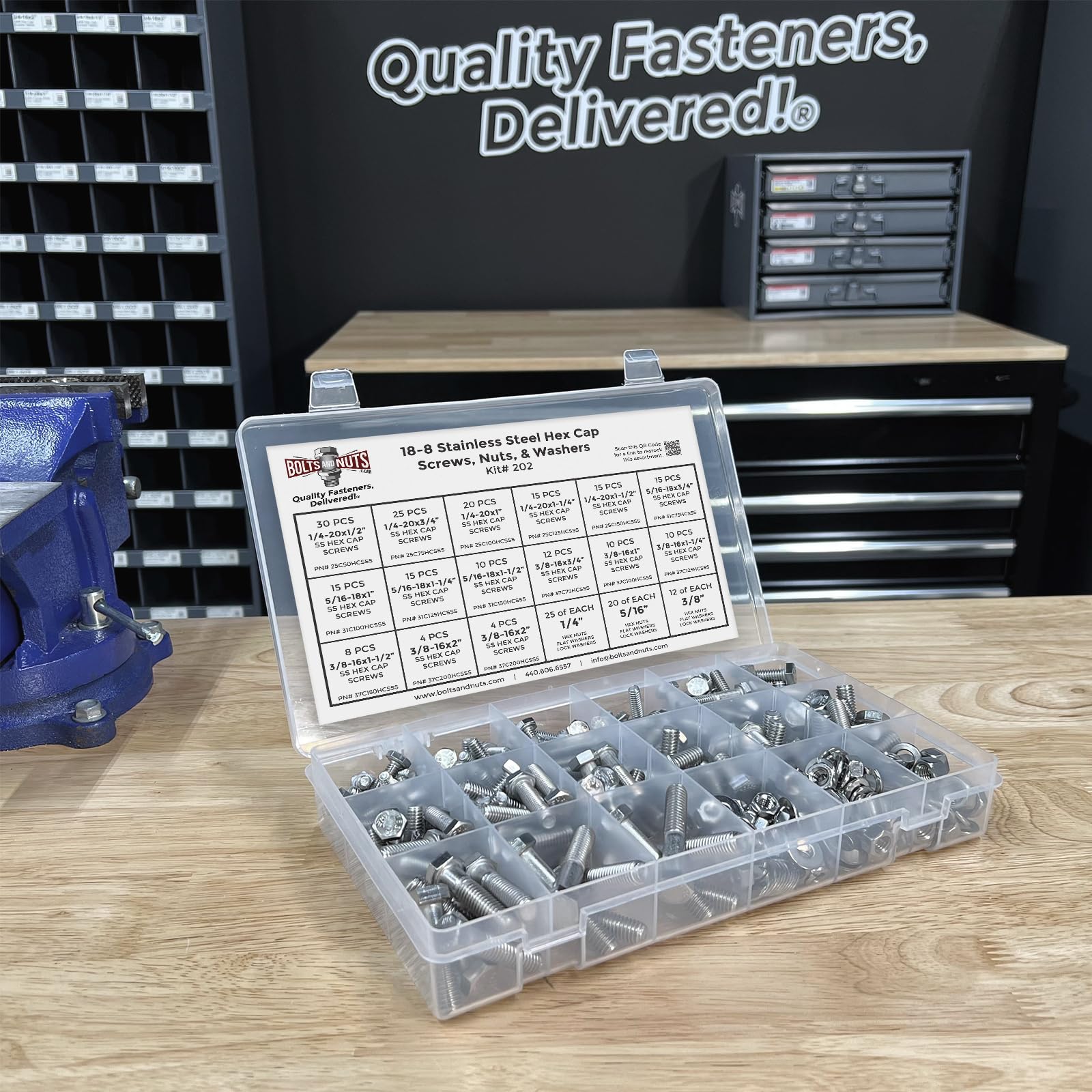 Inch 18-8 Stainless Steel Hex Cap Screws, Hex Nuts, Flat & Lock Washers - 380 PCS
