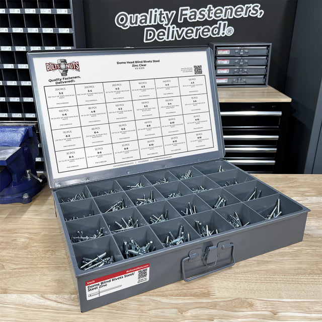 Part Number: assortment-kit-209 Dome Head Blind Rivets Steel/Steel Mandrel Container Information: *Please note the container will ship & arrive separately from the fasteners.