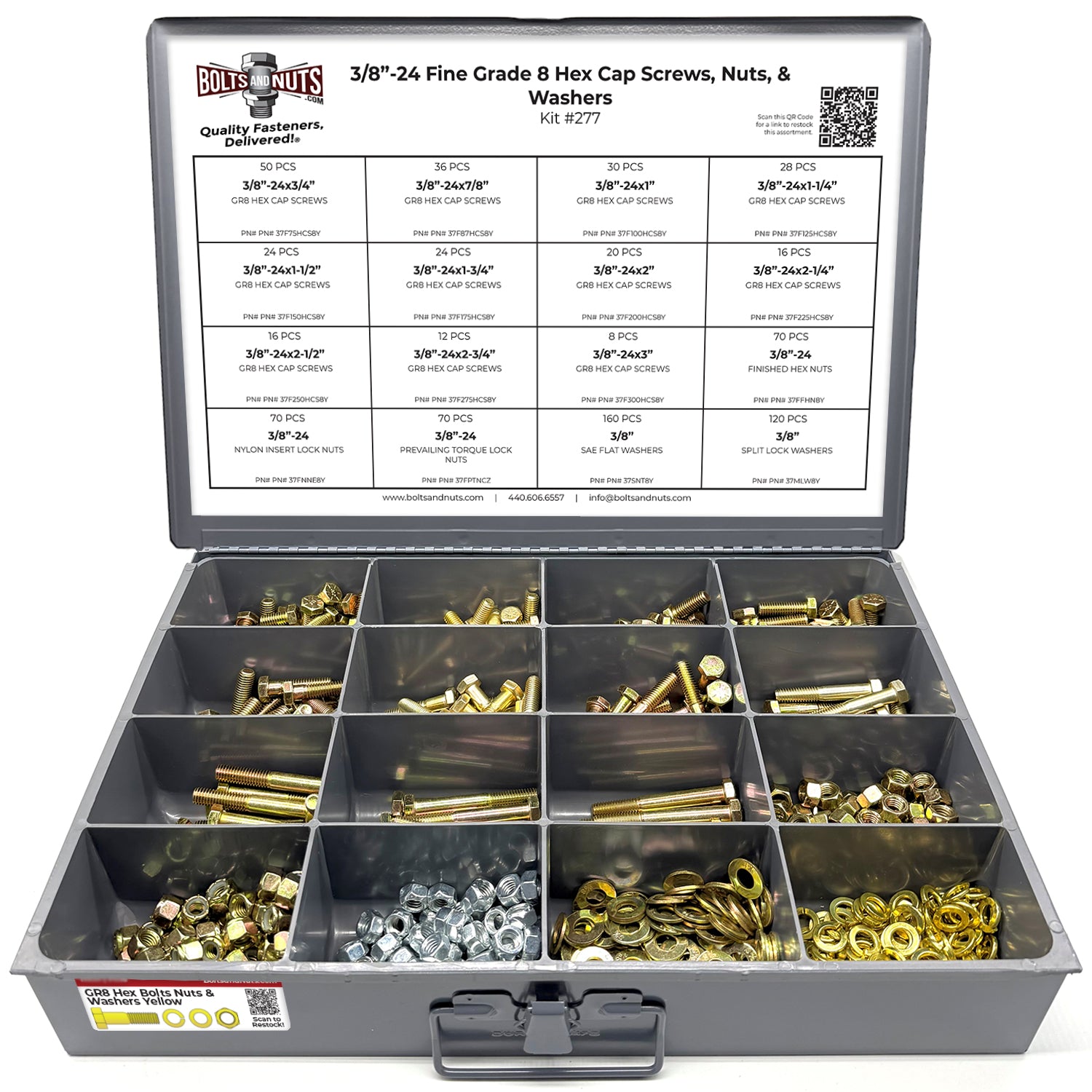 Part Number: Assortment Kit #277 755 Pieces - Fine Thread Bolt Information: Nut Information: Washers Information: Container Information: *Please note the container will ship & arrive separately from the fasteners.