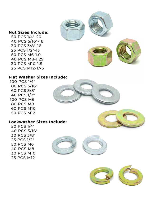 Inch & Metric Grade 8 Hex Nut, Flat & Lock Washer Assortment - 1150 PCS