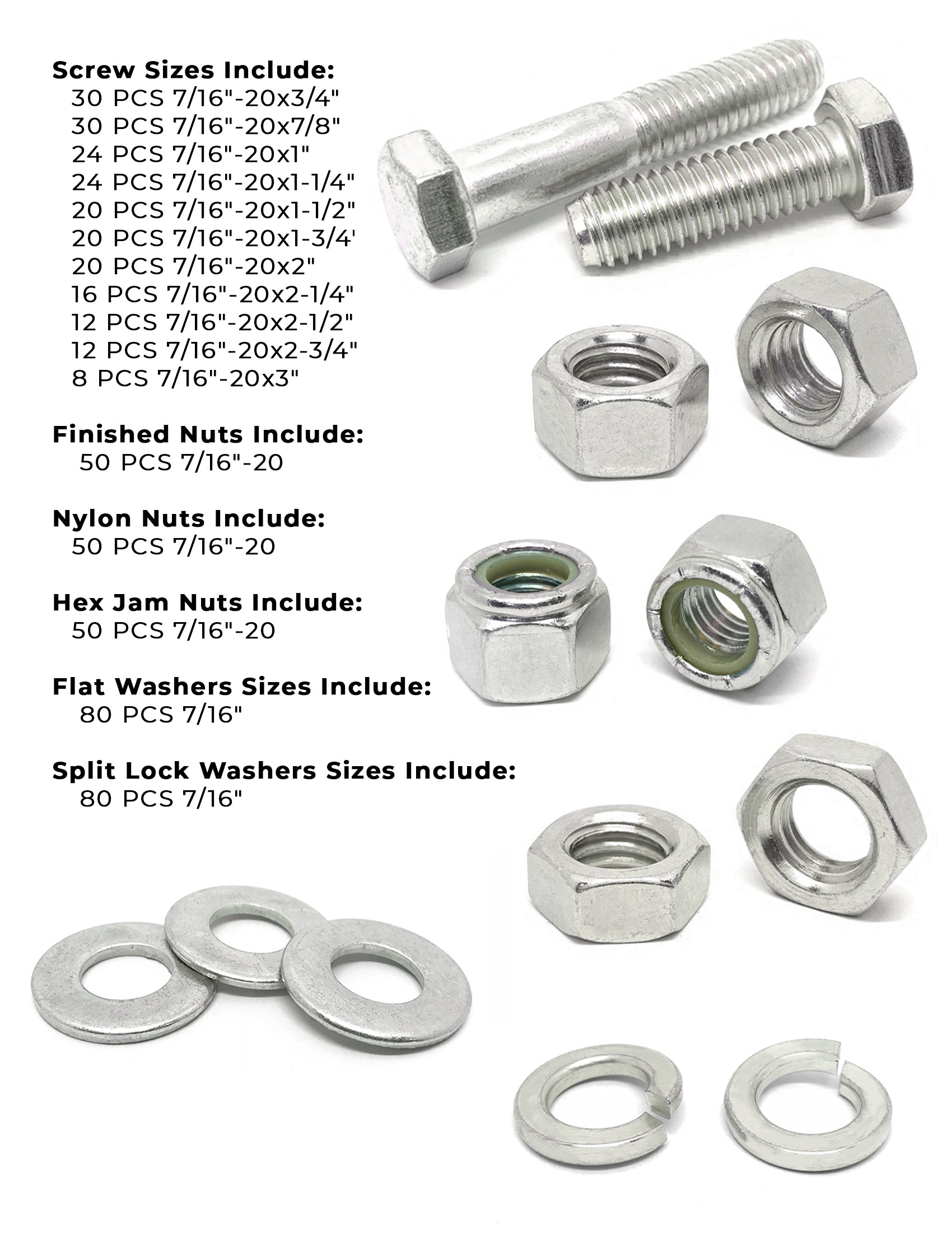 7/16"-20 Fine 18-8 Stainless Steel Hex Cap Screws, Nuts, & Washers - 528 PCS