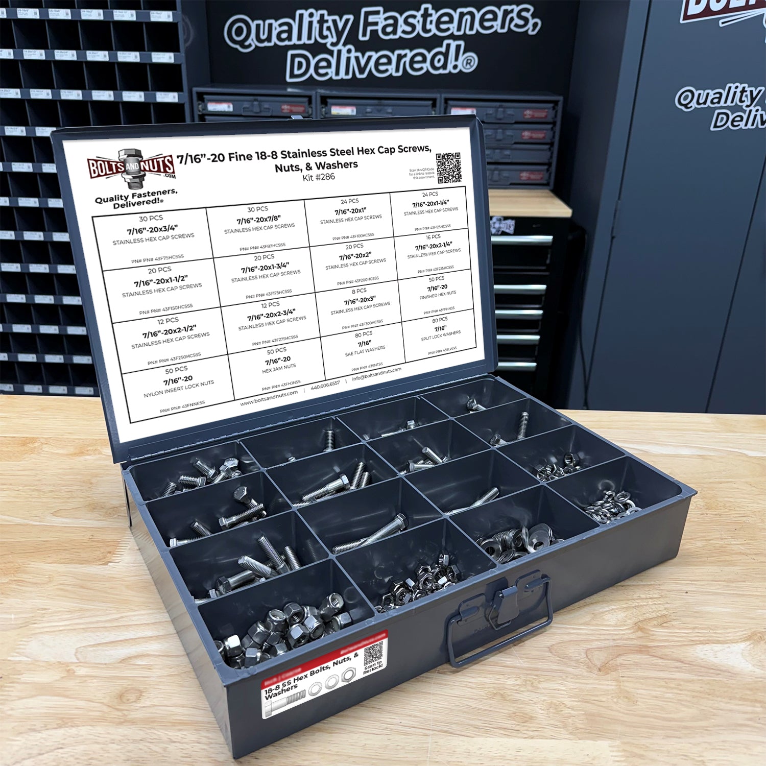 Part Number: Assortment Kit #286 528 Pieces - Fine Thread Bolt Information: Nut Information: Washers Information: Container Information: *Please note the container will ship & arrive separately from the fasteners.