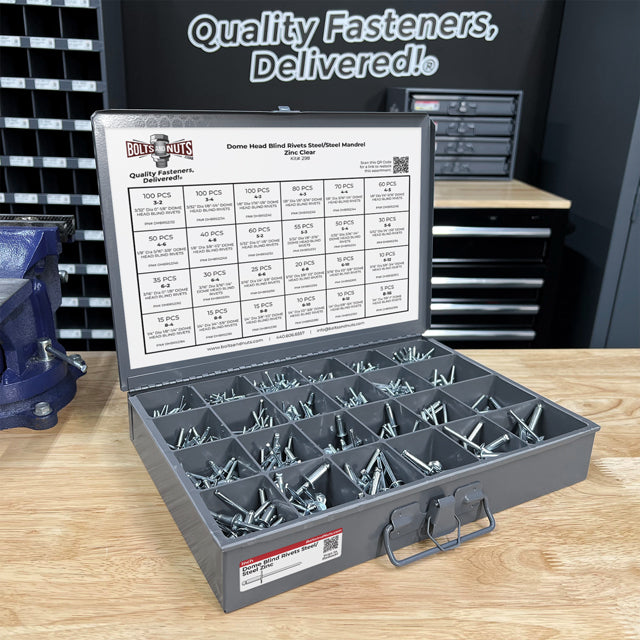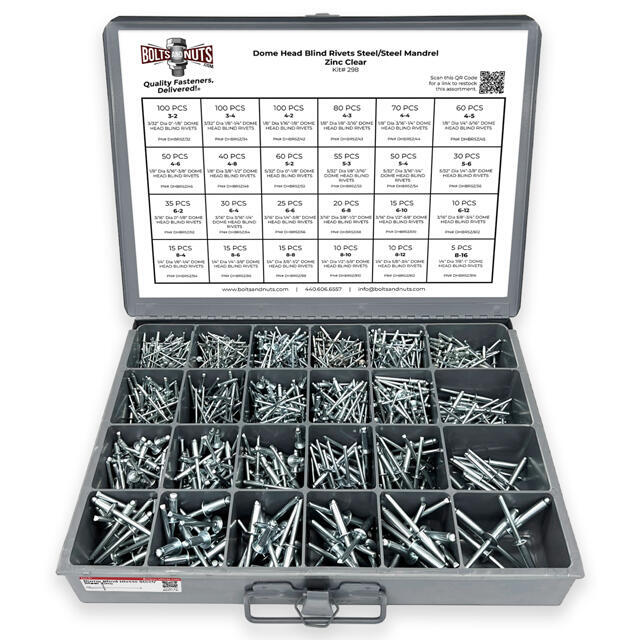Part Number: assortment-kit-298 Dome Head Blind Rivets Steel/Steel Mandrel Container Information: