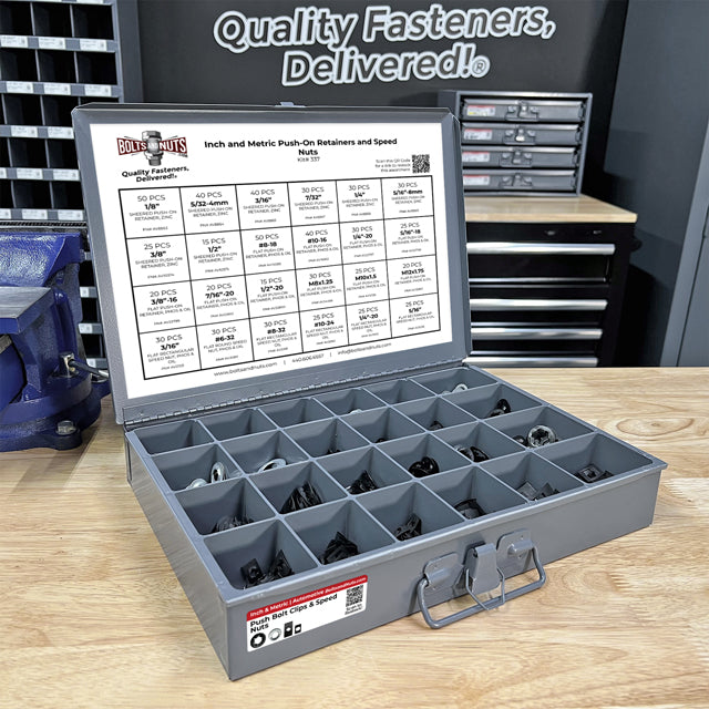 Part Number: Assortment Kit #337 696 Pieces - Inch and Metric Push-On Bolt Retainers and Speed Nuts Container Information: 1 - Gray Cold Rolled Steel Individual Small Scoop Box, 13-3/8" Width x 2" Height x 9-1/4" Depth, 24 Compartment Tray Box