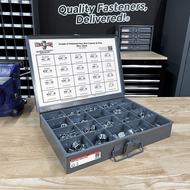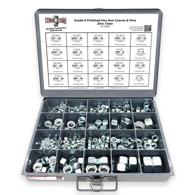 Part Number: Assortment Kit #355 381 Pieces - Coarse & Fine Thread Grade 5 Finished Hex Nut Nut Information: