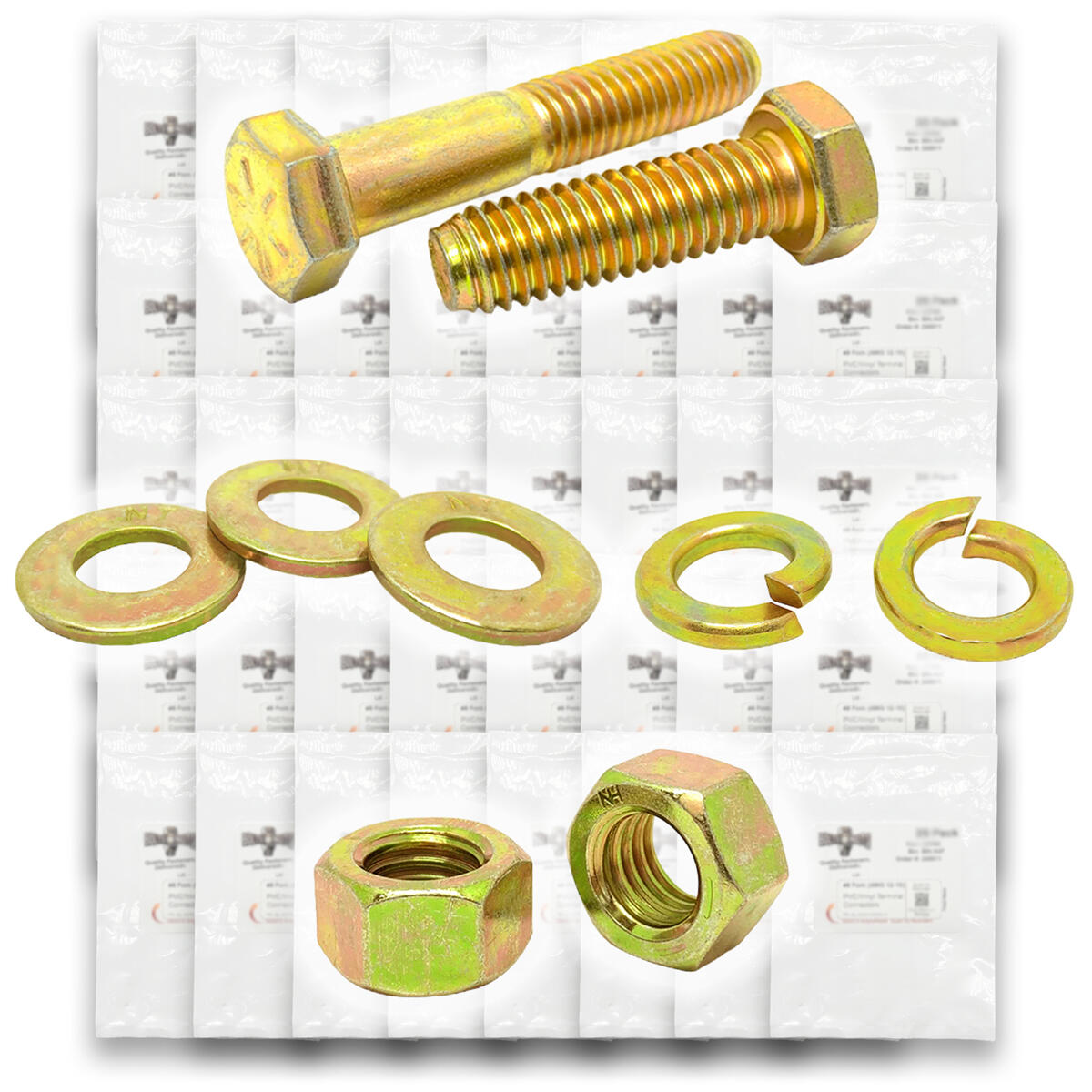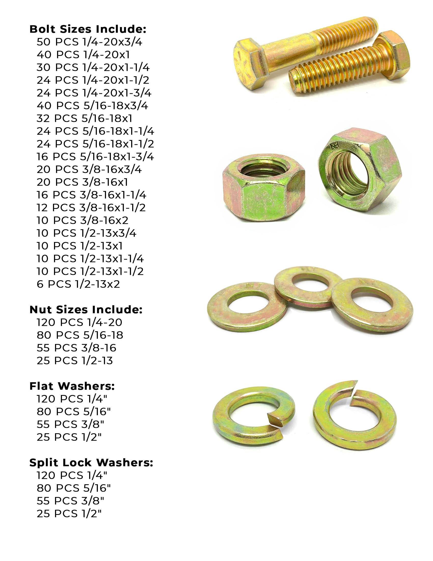 Inch Grade 8 Hex Cap Screws, Hex Nuts, Flat & Lock Washers Coarse Thread Zinc Yellow 1/4", 5/16" 3/8", & 1/2" - 1268 PCS