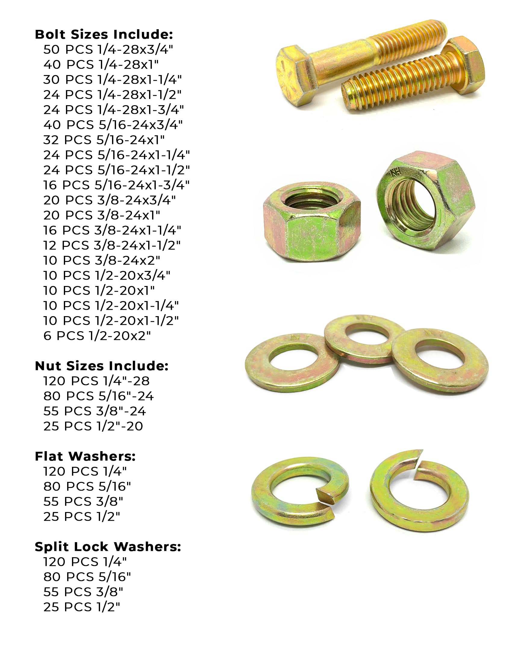 Inch Grade 8 Hex Cap Screws, Hex Nuts, Flat & Lock Washers Fine Thread Zinc Yellow 1/4", 5/16" 3/8", & 1/2" - 1268 PCS