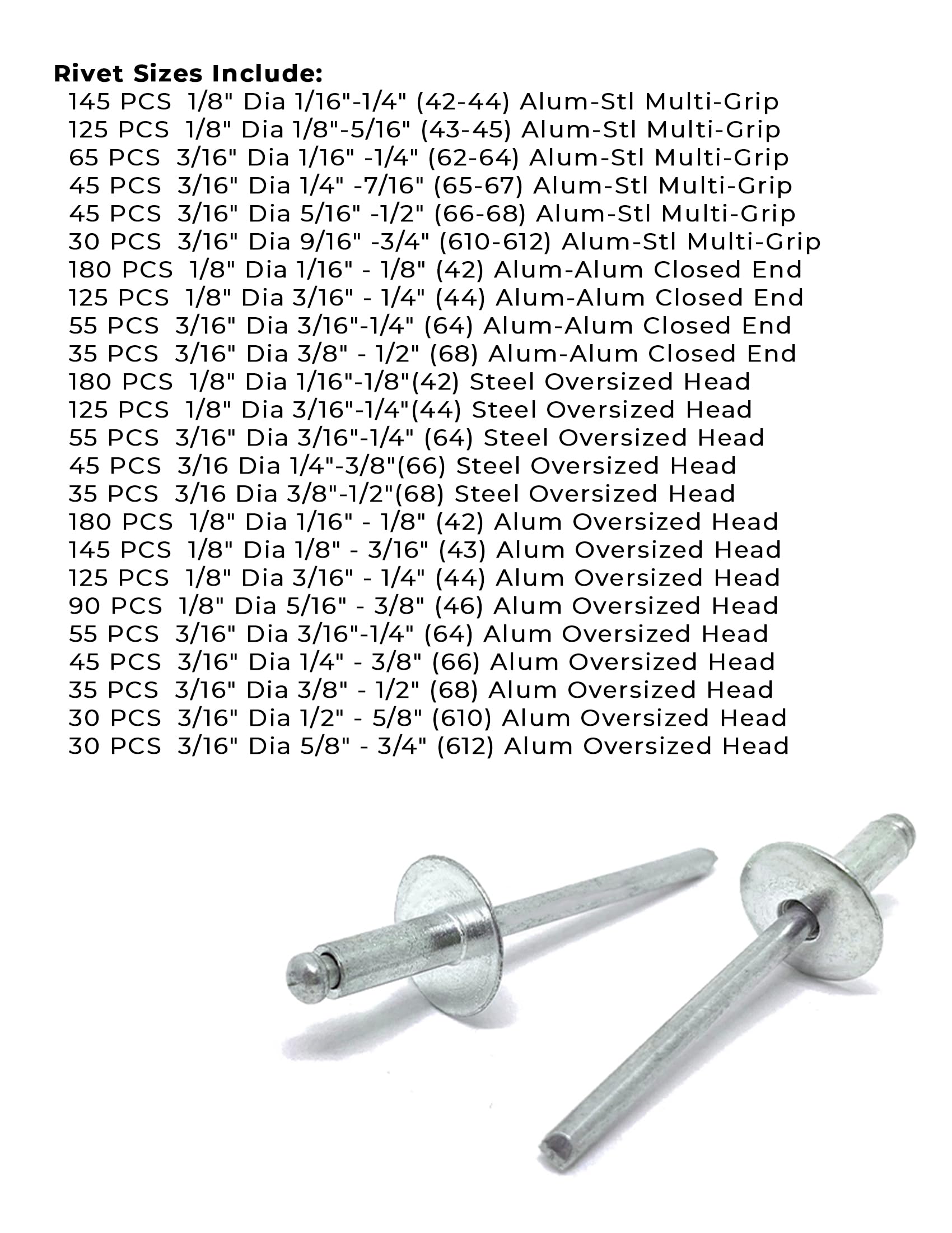 Aluminum and Steel Multi-Grip, Closed-End, & Oversized Head Rivets Assortment - 2025 PCS