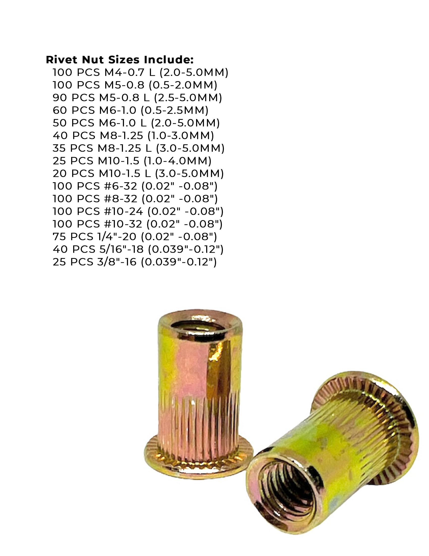 Inch & Metric Steel Rivet Nuts Zinc Yellow Assortment - 1060 PCS
