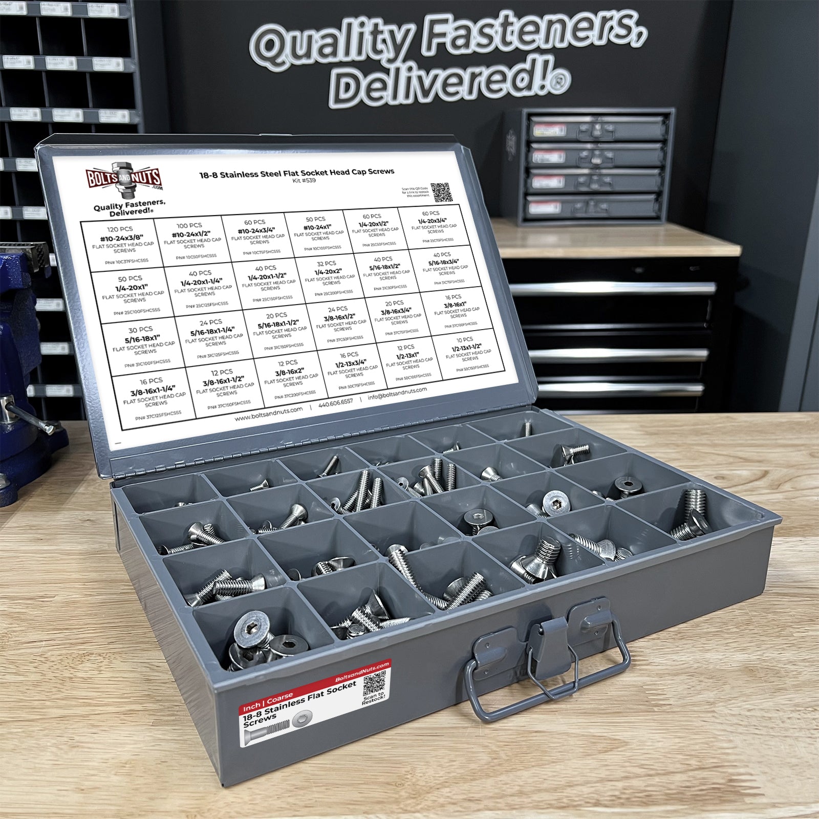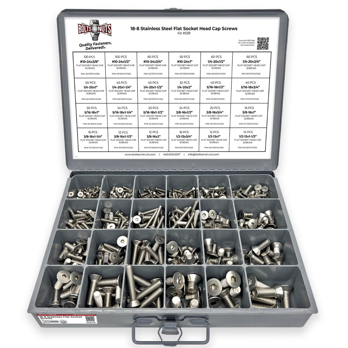 Part Number: assortment-kit-539 905 Pieces - Coarse Thread Container Information: 1 - Gray Cold Rolled Steel Individual Small Scoop Box, 18-5/16" Width x 3-1/16" Height x 12-7/16" Depth, 24 Compartment Tray Box *Please note the container will ship & arrive separately from the fasteners.