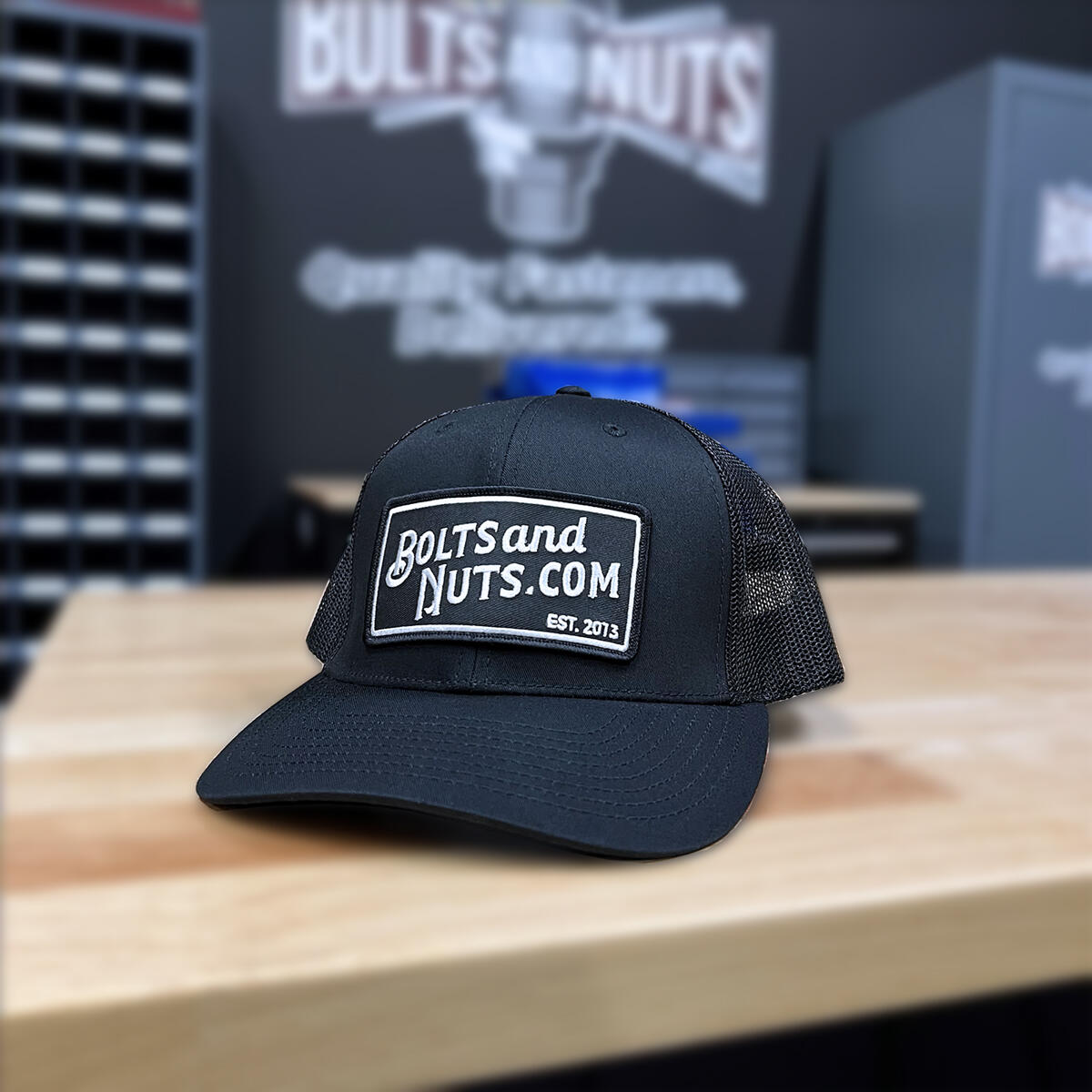 High Quality Black Front / Black Back Patch Vintage BoltsandNuts.com Logo Trucker Hat. Features an Adjustable Snap Back (1 Size Fits All) and a Mesh Back. Stitched On A Richardson 112 Hat.