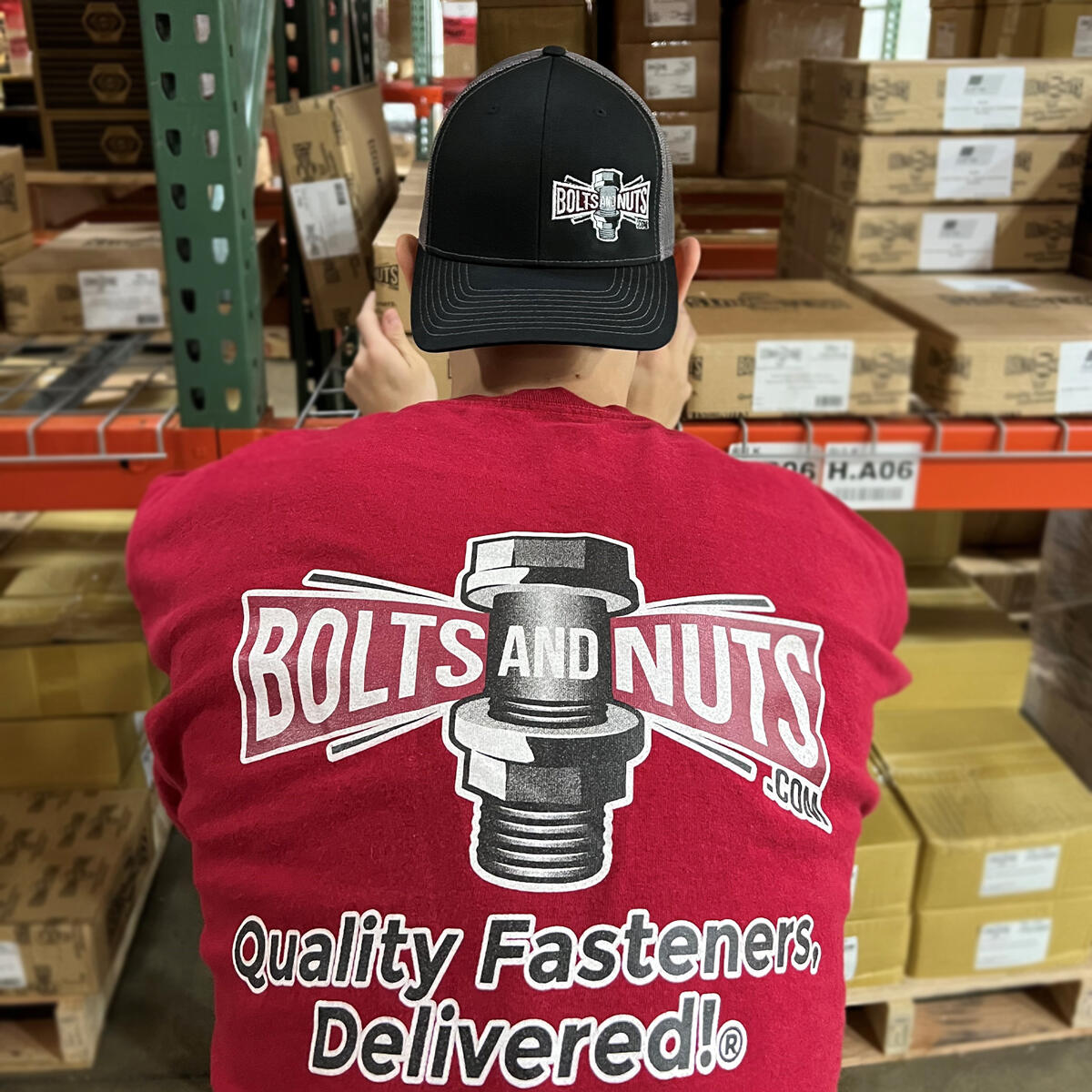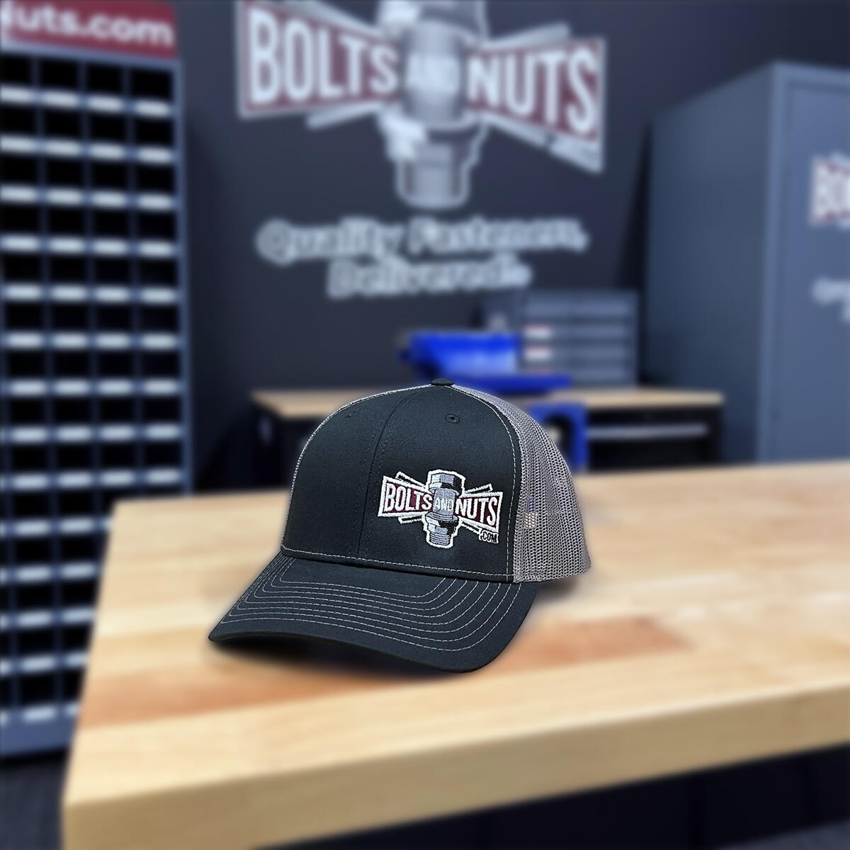 High Quality Black Front / Gray Back Embroidered BoltsandNuts.com Logo Trucker Hat. Features an Adjustable Snap Back (1 Size Fits All) and a Mesh Back. Printed On A Richardson 112 Hat.
