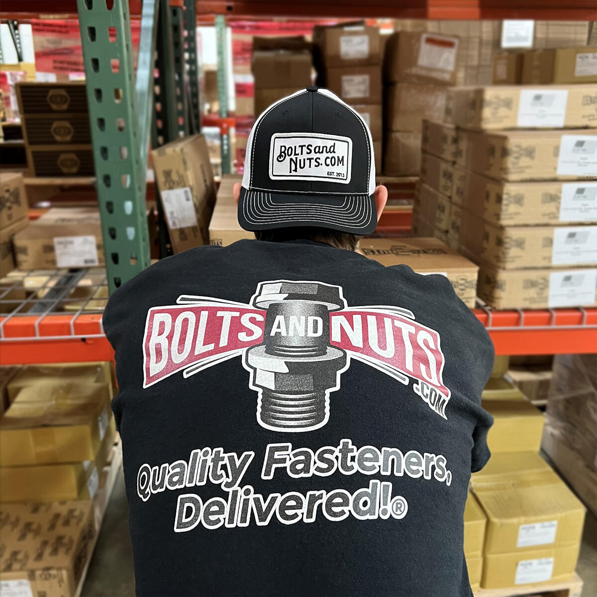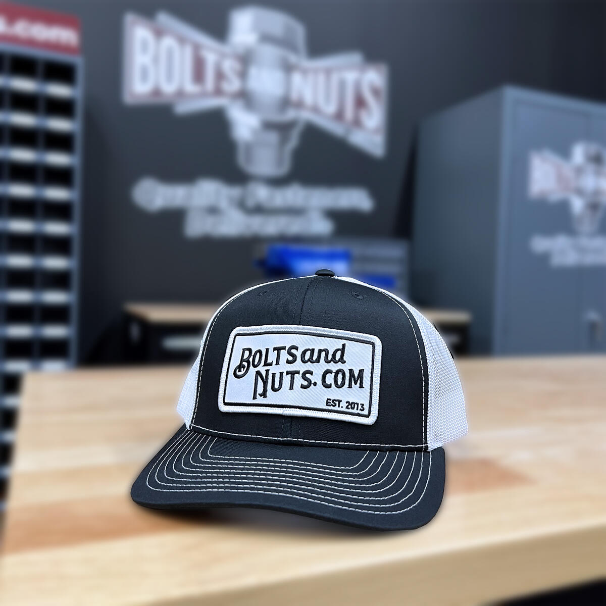 High Quality Black Front / White Back Patch Vintage BoltsandNuts.com Logo Trucker Hat. Features an Adjustable Snap Back (1 Size Fits All) and a Mesh Back. Stitched On A Richardson 112 Hat.