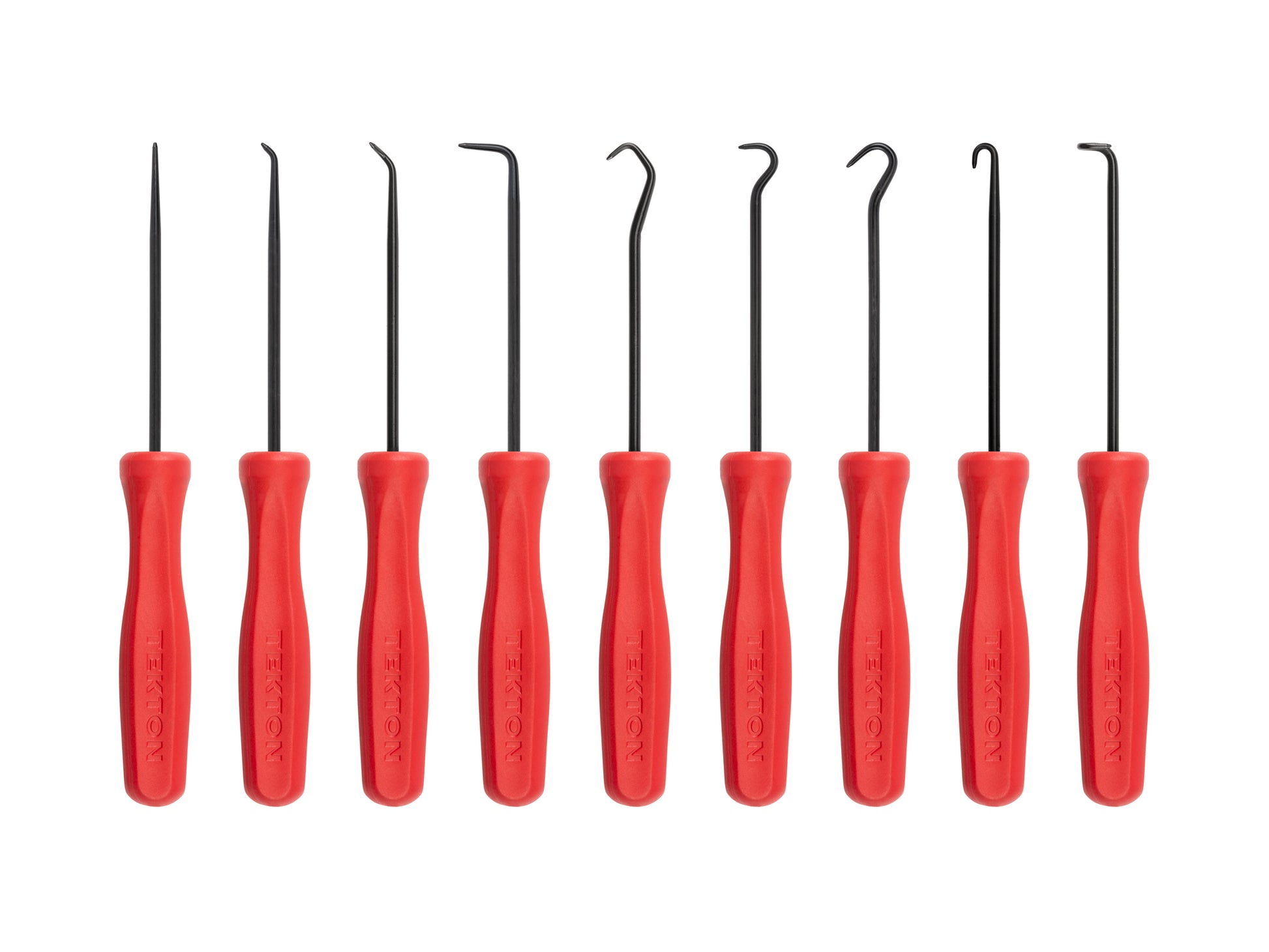 The Tekton 9-Piece Blunt Pick Set has five blunt picks and four blunt hooks for a variety of precise applications. The rounded tips have a 0.040 inch diameter (about the size of a ballpoint pen) that reduces the risk of damage to soft or fragile workpieces. Two "wings" on the base of each shank help resist twisting or being pulled out of the handle. The classic square handle is long and slender with contoured sides for overall versatility and maneuverability. All items in this set feature AISI 8650 steel shafts that are made from a strong Ni-Cr-Mo alloy that's hardened to 50–54 HRC. The handles are made from glass-reinforced nylon that's resistant to fuels, oils, and chemicals. Our family of mini pry bar, pick, and hook products is made entirely in Michigan with only USA-sourced materials. Machining, bending, coining, handle molding, and press-fitting the handle and shank take place at our Grand Rapids, Michigan, manufacturing facility.