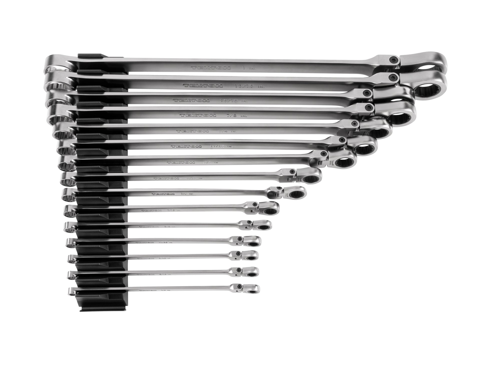 Long Fixed/Flex Head 12-Point Ratcheting Box End Wrench Set with Modular Organizers, 15-Piece (1/4-1 in.)