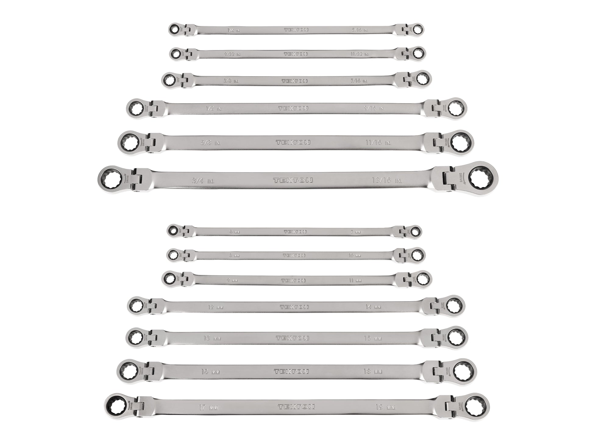 Each Tekton long ratcheting flex head wrench is permanently marked with both a high-visibility laser marking and a stamped marking for easy size identification. The 12-point box end fits multiple types of fasteners including 6-point, 12-point, and square. The 1/4, 9/32, 5/16, and 11/32 inch and 6, 7, 8, and 9 mm heads have 60-tooth ratcheting mechanisms, the rest have 72-tooth mechanisms. The flex head sweeps smoothly through 180-degrees without any set positions. This allows the wrench to operate at any angle and navigate around obstructions in its swing path, and the longer length offers added reach and increased leverage. The wrench is abrasive-blasted to create a finely textured finish and then plated with a trivalent chrome process, ensuring that the finish won't flake off or corrode over time.