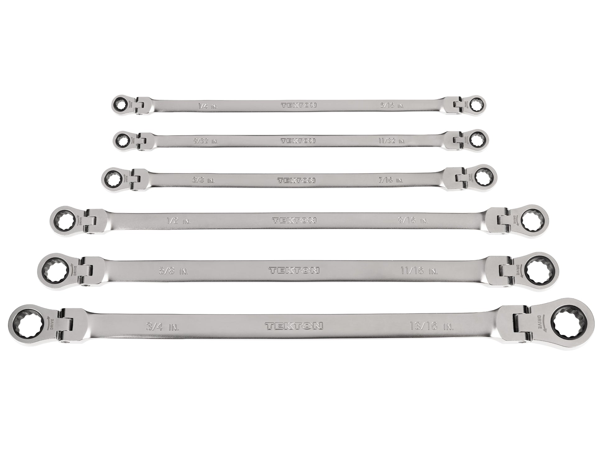 Each Tekton long ratcheting flex head wrench is permanently marked with both a high-visibility laser marking and a stamped marking for easy size identification. The 12-point box end fits multiple types of fasteners including 6-point, 12-point, and square. The 1/4, 9/32, 5/16, and 11/32 inch heads have 60-tooth ratcheting mechanisms, the rest have 72-tooth mechanisms. The flex head sweeps smoothly through 180-degrees without any set positions. This allows the wrench to operate at any angle and navigate around obstructions in its swing path, and the longer length offers added reach and increased leverage. The wrench is abrasive-blasted to create a finely textured finish and then plated with a trivalent chrome process, ensuring that the finish won't flake off or corrode over time.