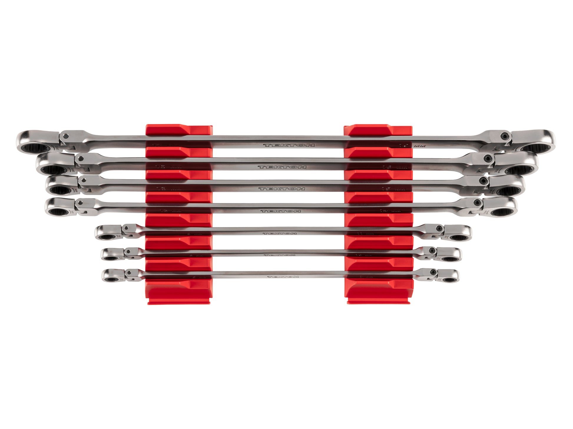 Each Tekton long ratcheting flex head wrench is permanently marked with both a high-visibility laser marking and a stamped marking for easy size identification. The 12-point box end fits multiple types of fasteners including 6-point, 12-point, and square. The 6, 7, 8, and 9 mm heads have 60-tooth ratcheting mechanisms, the rest have 72-tooth mechanisms. The flex head sweeps smoothly through 180-degrees without any set positions. This allows the wrench to operate at any angle and navigate around obstructions in its swing path, and the longer length offers added reach and increased leverage. The wrench is abrasive-blasted to create a finely textured finish and then plated with a trivalent chrome process, ensuring that the finish won't flake off or corrode over time. The set includes a modular wrench organizer that fits most toolbox drawers, keeping your ratcheting wrenches neatly arranged with consistent spacing.
