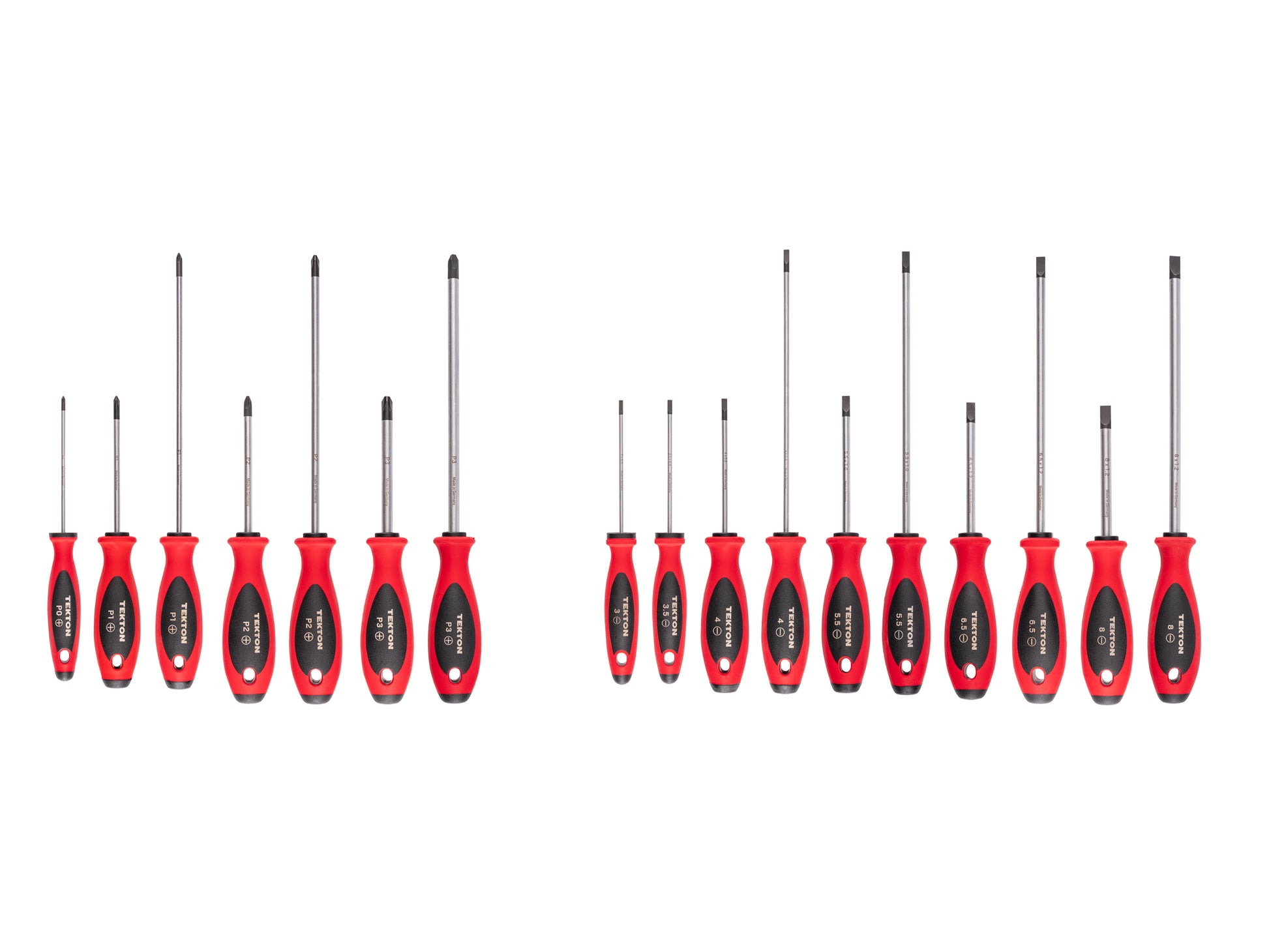 Tekton screwdrivers have handles that are designed for speed and torque. The front of the handle is round for quick turning and the middle transitions to a tri-lobe shape that provides a secure grip for high-torque driving. The handle’s red exterior is made of a lightly textured TPE material that is slightly soft and grippy for controlled spinning, fine adjustments, and reduced slipping under torque. Handle materials resist most common shop chemicals. Each driver has the tip size engraved in four locations with high-contrast laser markings. Each screwdriver handle has the same size through-hole so you can hang it on a hook. You can also attach a safety lanyard when working at heights to prevent drops. Tips are precisely machined and coated with black manganese phosphate, creating a slightly rough surface that enhances screw engagement. The conversion coating produces a uniform, corrosion-resistant layer that preserves tip geometry and doesn’t chip or flake off. The end of the shank is flattened to form a broad surface that resists twisting inside the handle. The handle is molded around the shank, creating a solid connection that is stronger and straighter than simply pressing the shank into a premade handle. This set includes Phillips (JIS compatible) and slotted drivers.