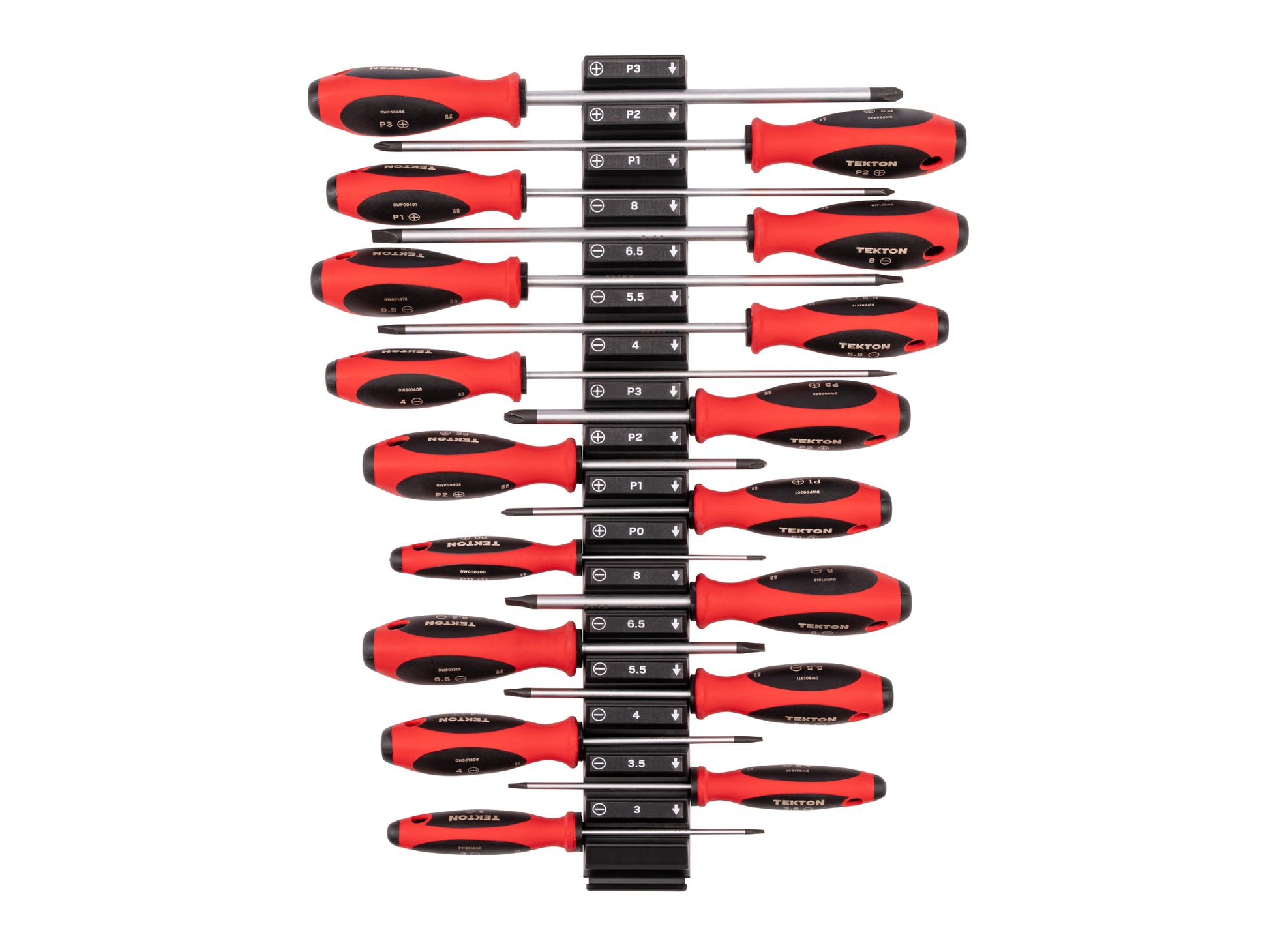 Tekton screwdrivers have handles that are designed for speed and torque. The front of the handle is round for quick turning and the middle transitions to a tri-lobe shape that provides a secure grip for high-torque driving. The handle’s red exterior is made of a lightly textured TPE material that is slightly soft and grippy for controlled spinning, fine adjustments, and reduced slipping under torque. Handle materials resist most common shop chemicals. Each driver has the tip size engraved in four locations with high-contrast laser markings. Each screwdriver handle has the same size through-hole so you can hang it on a hook. You can also attach a safety lanyard when working at heights to prevent drops. Tips are precisely machined and coated with black manganese phosphate, creating a slightly rough surface that enhances screw engagement. The conversion coating produces a uniform, corrosion-resistant layer that preserves tip geometry and doesn’t chip or flake off. The end of the shank is flattened to form a broad surface that resists twisting inside the handle. The handle is molded around the shank, creating a solid connection that is stronger and straighter than simply pressing the shank into a premade handle. This set includes Phillips (JIS compatable) and slotted drivers with modular driver organizers.
