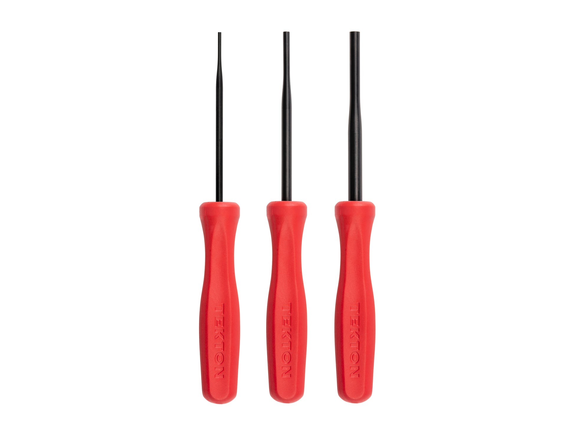 Tekton probes are ideal for precision applications. Their narrow, blunted tips won't damage delicate components. The classic square handles are long and slender with contoured sides for overall versatility and maneuverability. The AISI 8650 steel shanks are made from a strong Ni-Cr-Mo alloy that's hardened to 50–54 HRC. The handles are made from glass-reinforced nylon that's resistant to fuels, oils, and chemicals. Our family of mini pry bar, probe, pick, and hook products is made entirely in Michigan with only USA-sourced materials. Machining, bending, coining, handle molding, and press-fitting the handle and shank take place at our Grand Rapids, Michigan, manufacturing facility. This set includes 1/16, 1/8, and 3/16 inch tip probes.