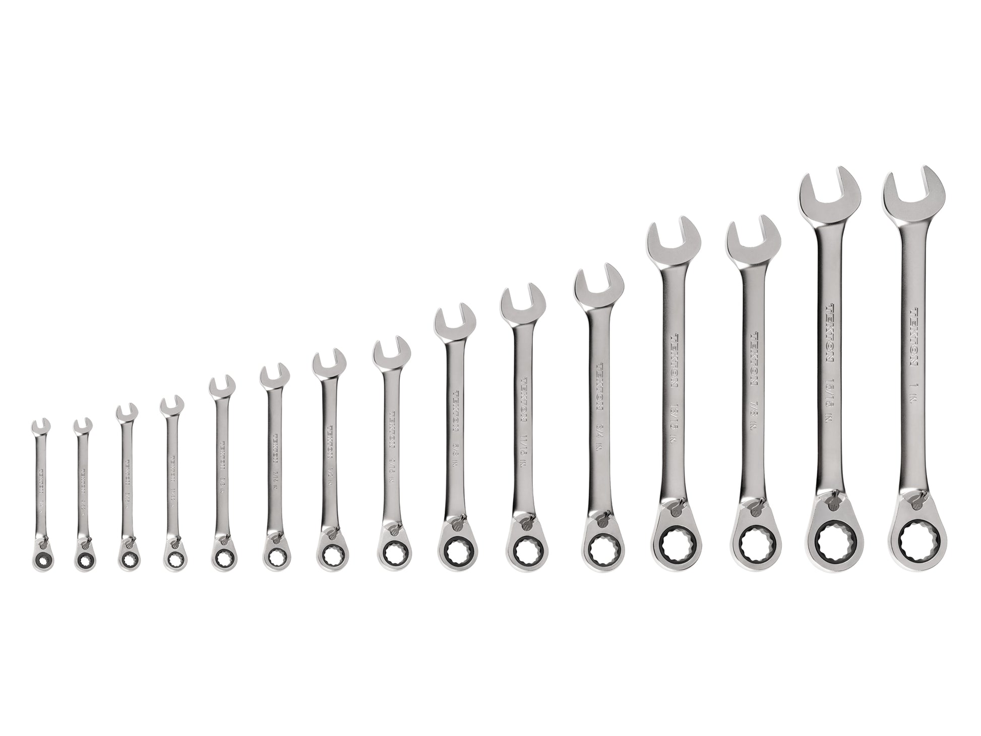 Each Tekton reversible ratcheting combination wrench is permanently marked with both a high-visibility laser marking and a stamped marking for easy size identification. The 12-point box end fits multiple types of fasteners including 6-point, 12-point, and square. The 1/4, 9/32, 5/16, and 11/32 inch wrenches have 60-tooth ratcheting mechanisms, the rest have 72-tooth mechanisms. The 15-degree offset box end wrench geometry creates clearance for your fingers and makes it easier to reach around obstructions. The drive switch allows you to quickly switch ratcheting directions while you're working. The wrench is abrasive-blasted to create a finely textured finish and then plated with a trivalent chrome process, ensuring that the finish won't flake off or corrode over time.
